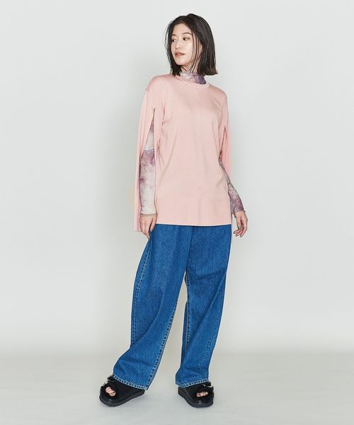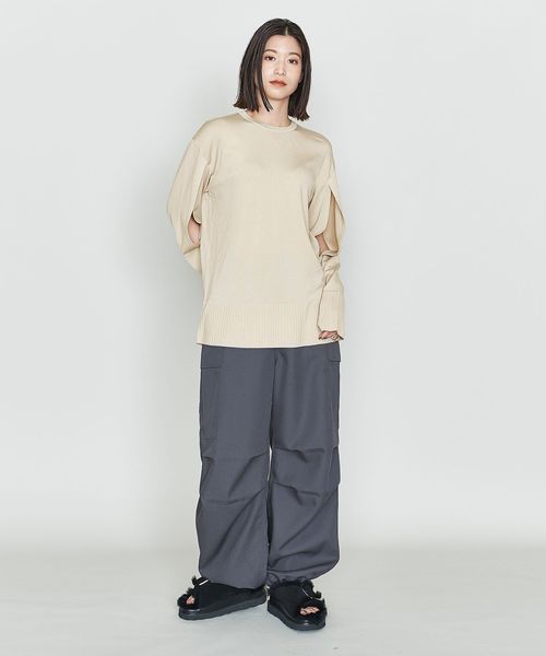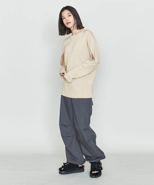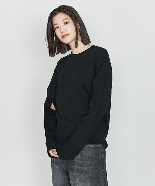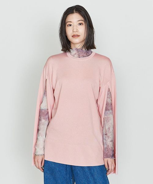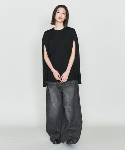 肩からひじにかけて深くスリットを入れて腕が出せるデザインのクルーネックニット。