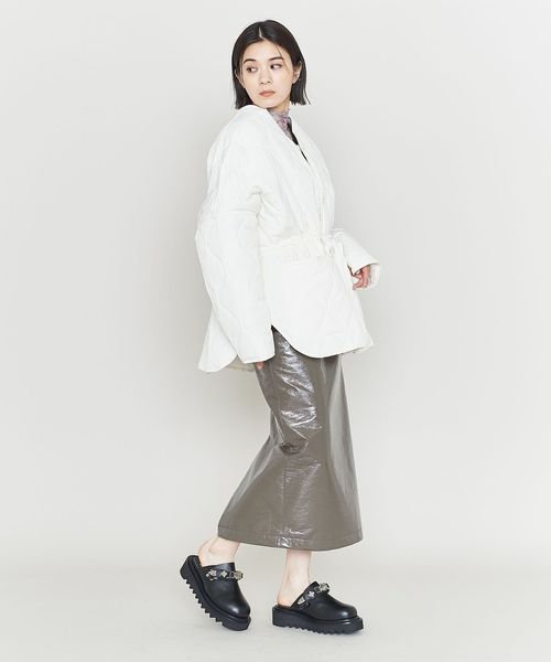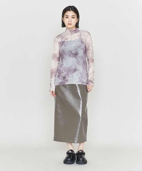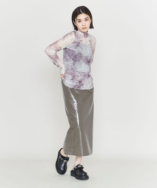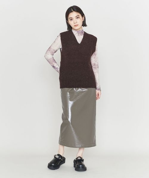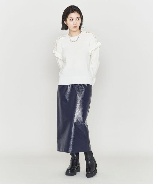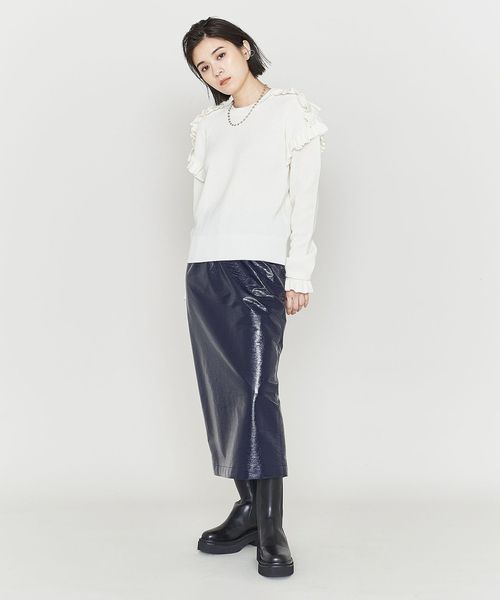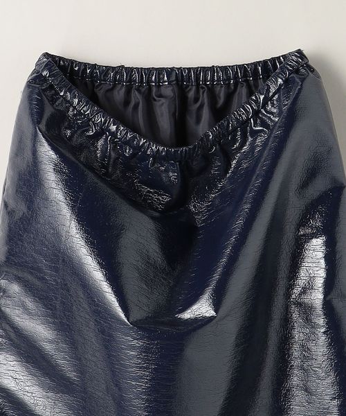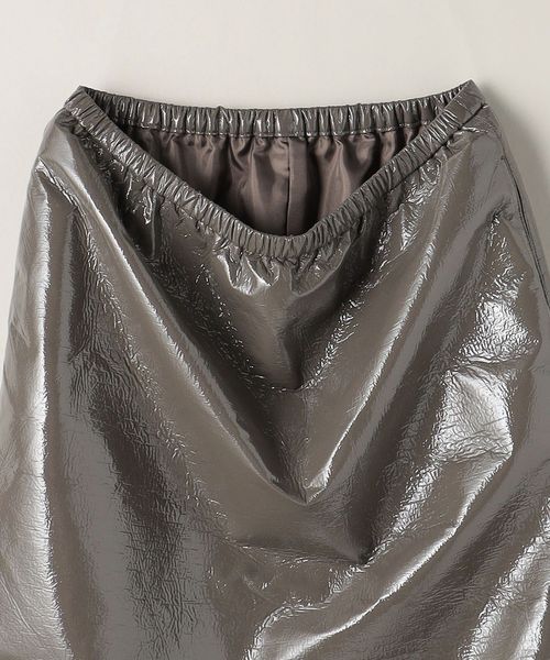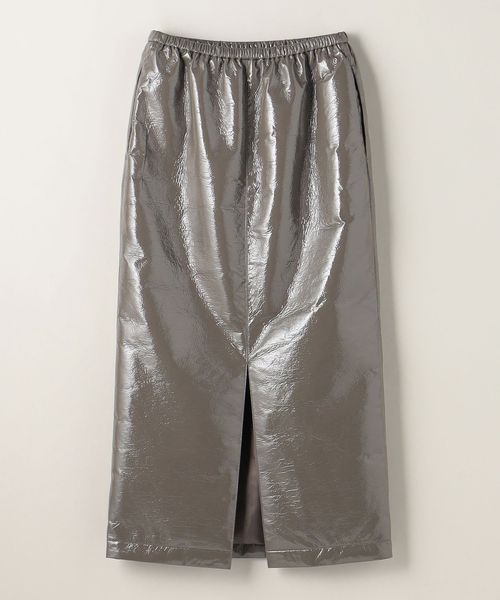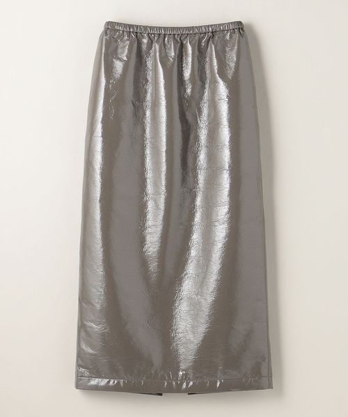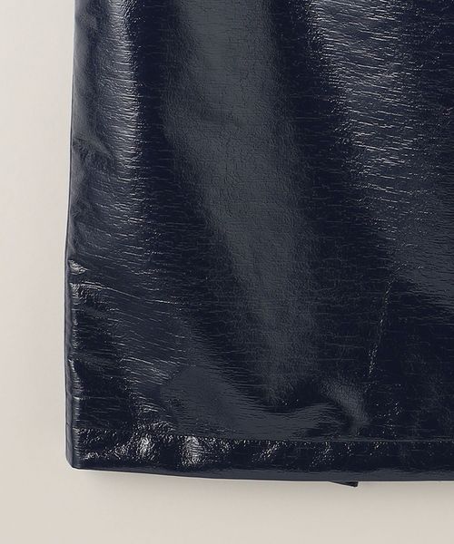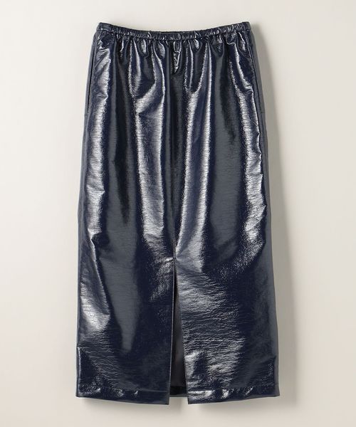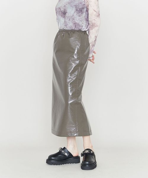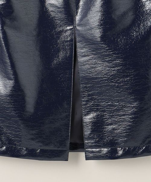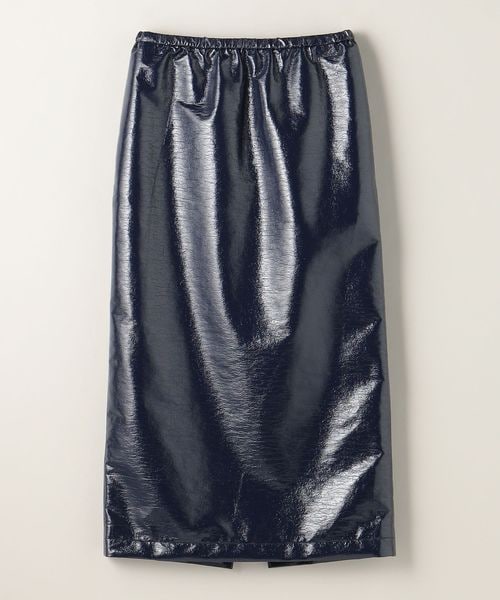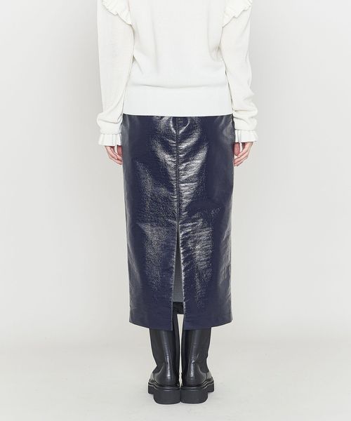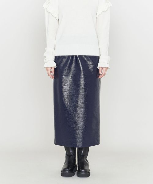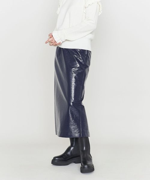 エナメル調の独特な素材感が着こなしにアクセントを添えてくれるタイトスカート。