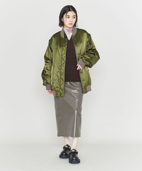 光沢感があるので、毛足のあるざっくりとしたニットをあわせるだけ着こなしが決まる1枚。