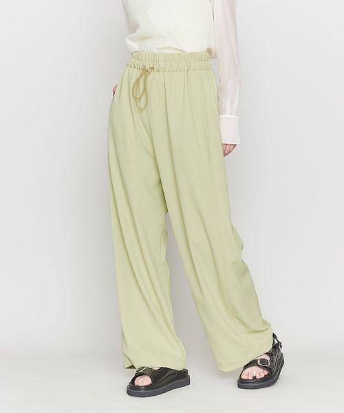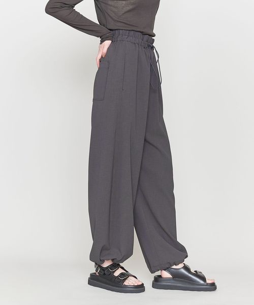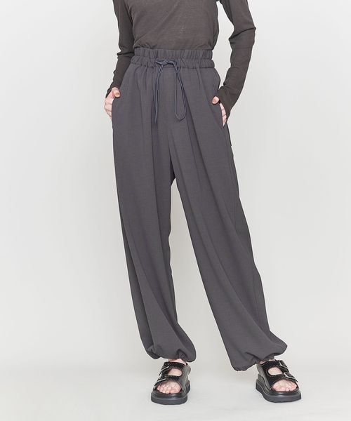 ウエストにギャザー、ヒップ周りに丸みをもたせたリラックス感漂うワイドパンツ。