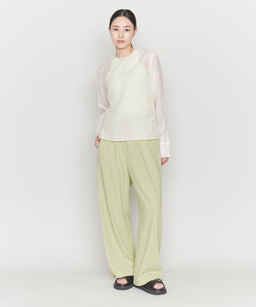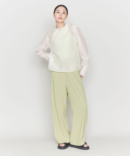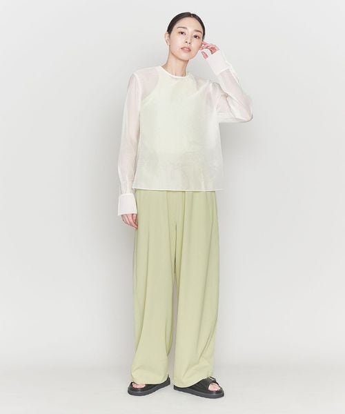 トップスにはシアートップスやコンパクトなシャツとあわせてすこし抜け感を取り入れた洗練されたスタイリングをおすすめします。
