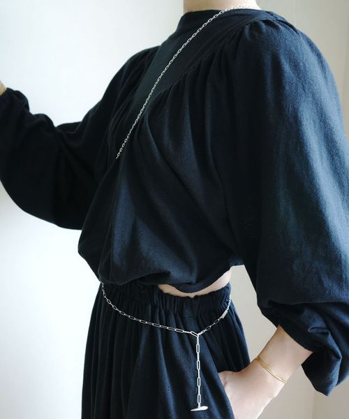 長さを調節できる仕様、薄手の洋服からニット等ボリュームのある洋服にもあわせられるデザイン。