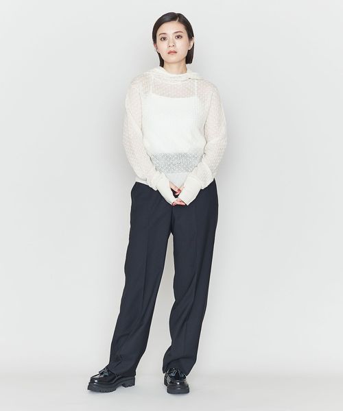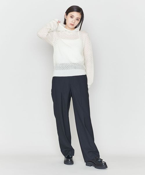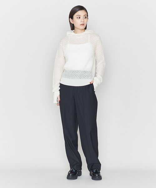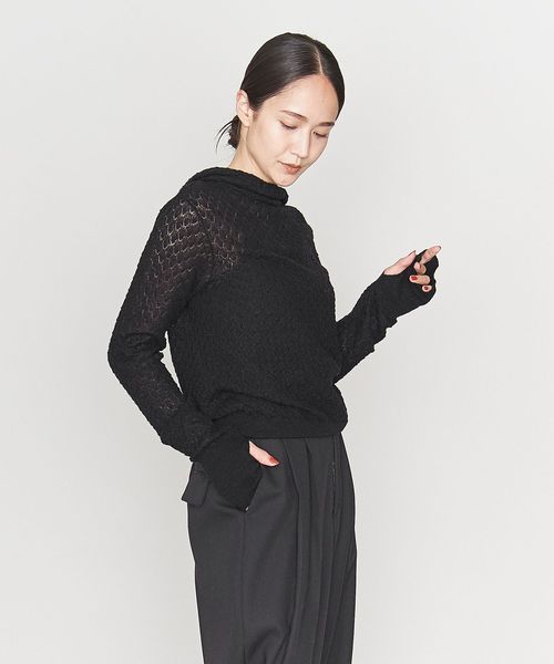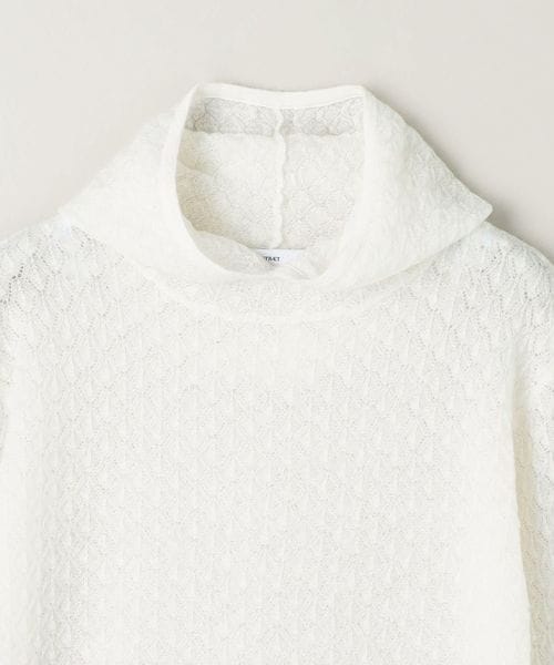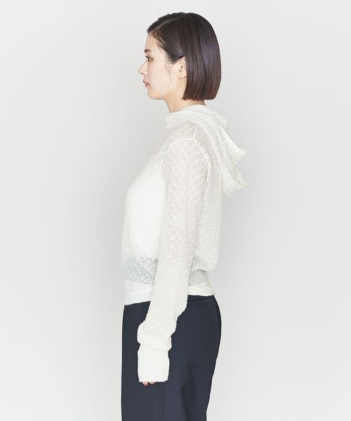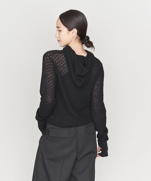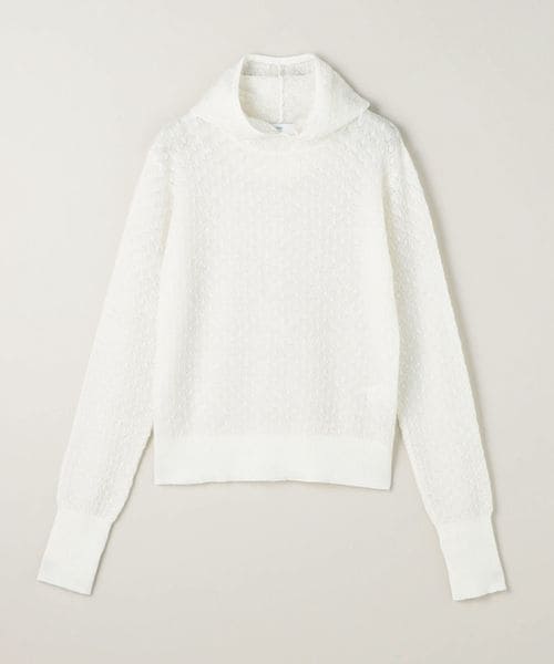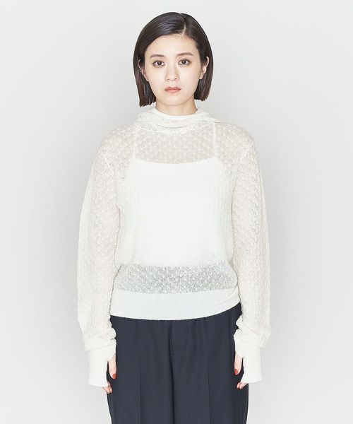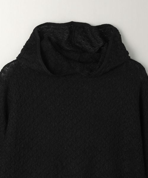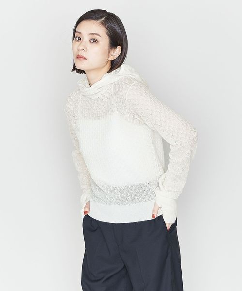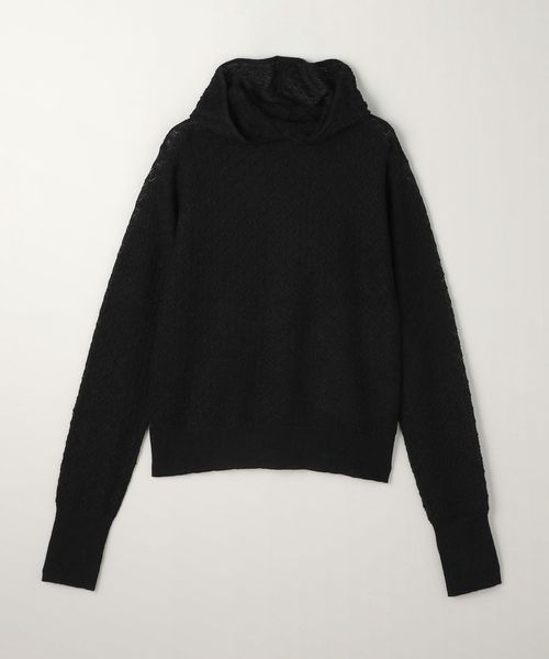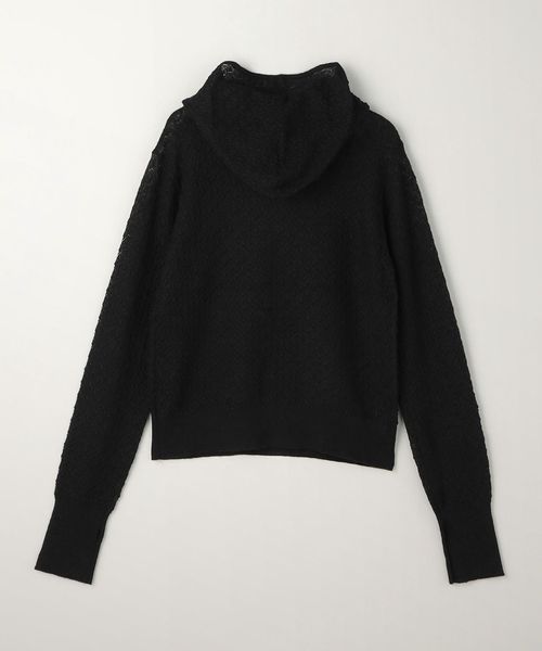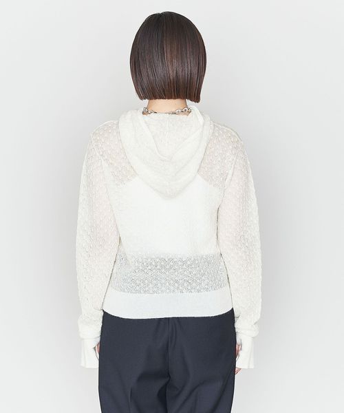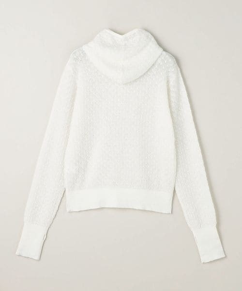 アイレットレースの様な軽くて薄い編地のフーデッドニットプルオーバー。