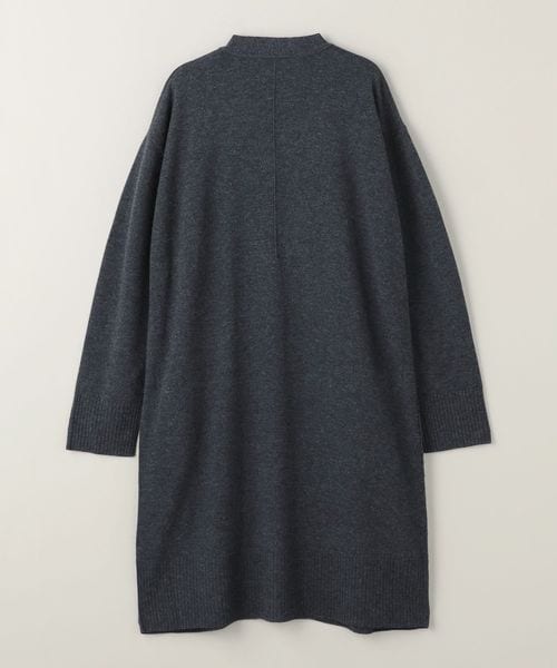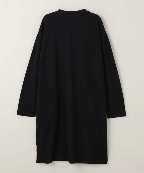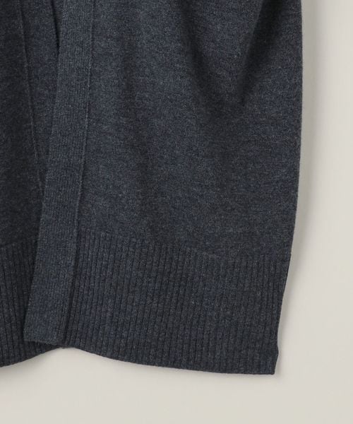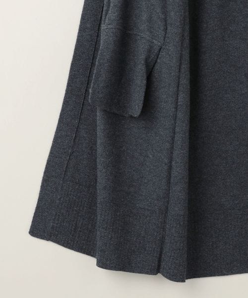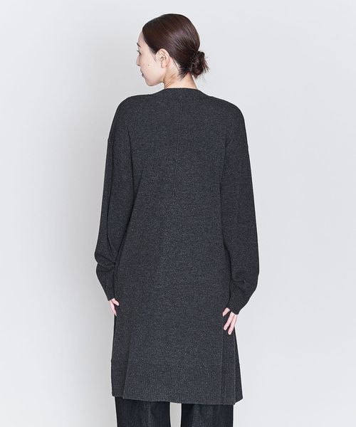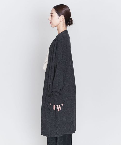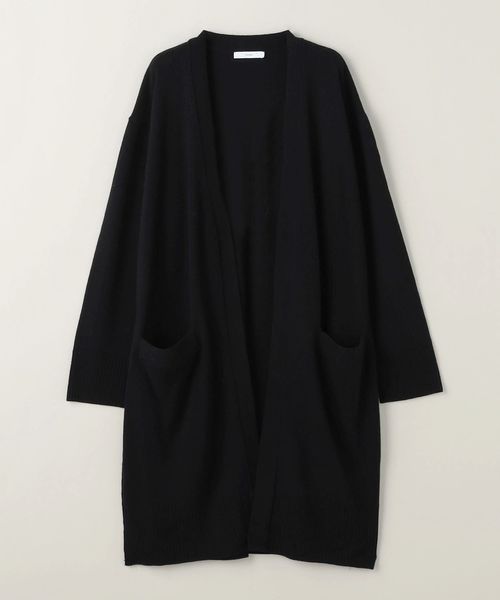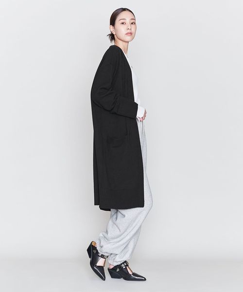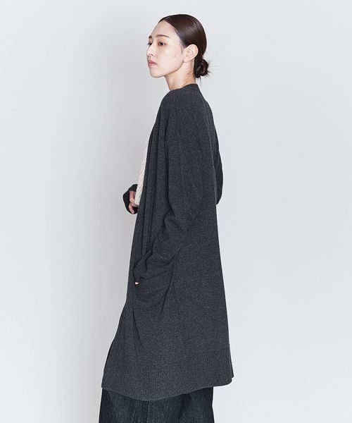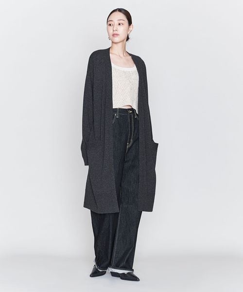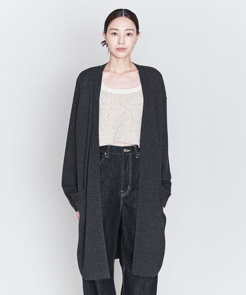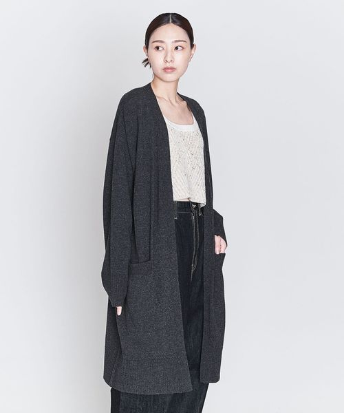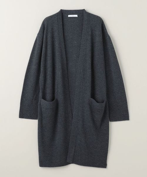 裾のリブやダーツがアクセントになったノーボタンのロングカーディガン。