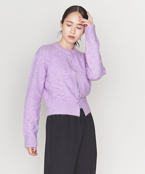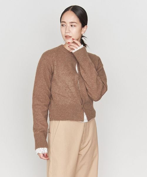 あえてフロントボタンを首元と裾の2ボタンにしてスリットが開いているような見え方にしたデザインのカーディガン。