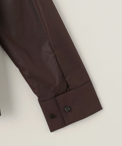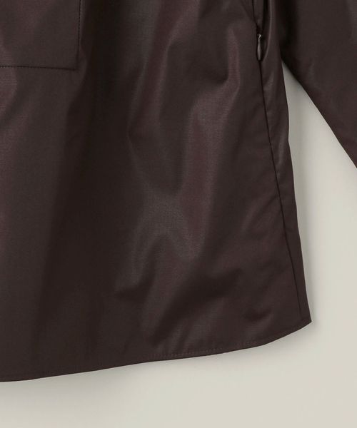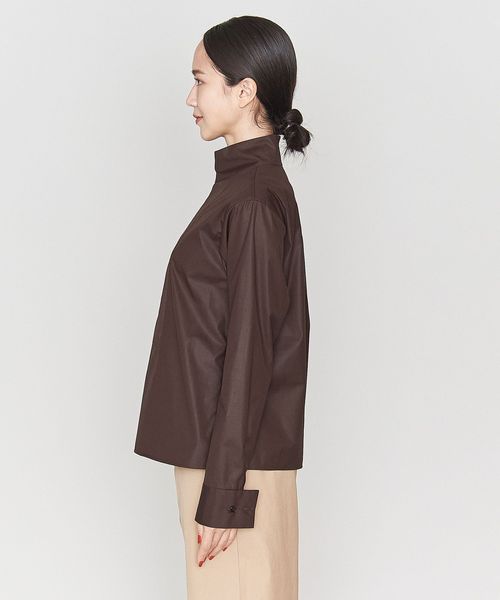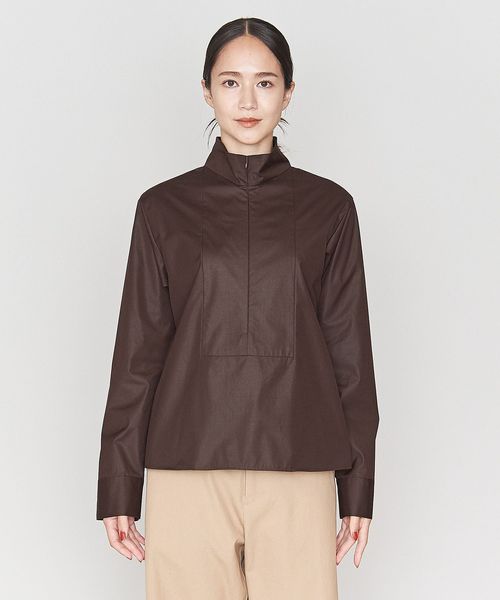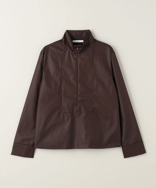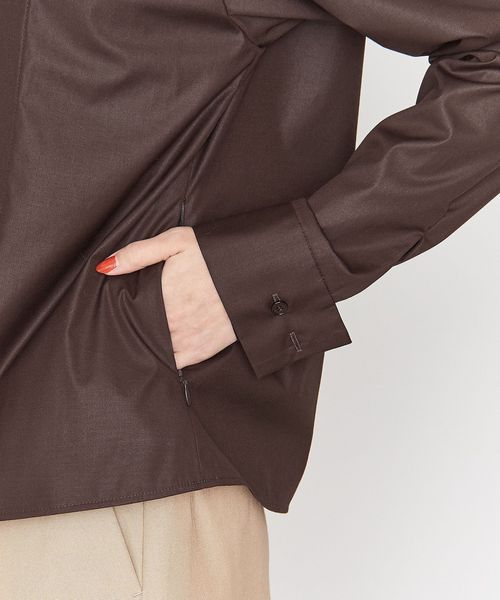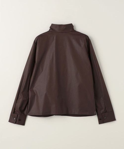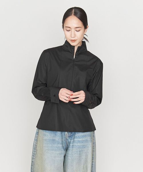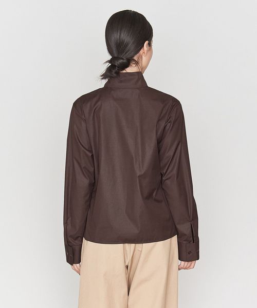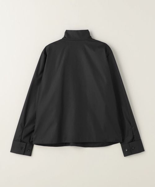 襟をあけるとオープンカラーのようになるハイネックのブルゾンライクなデザインのシャツ。
