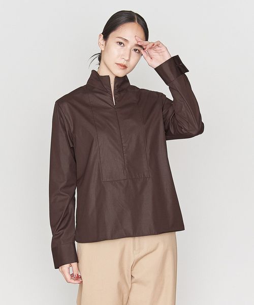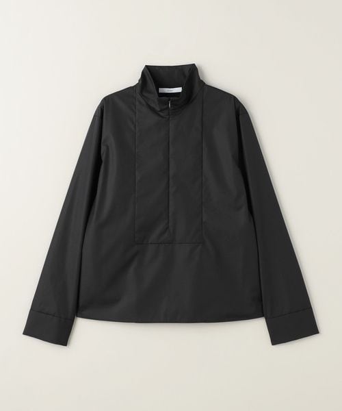 スポーティーな雰囲気漂うハーフジップのハイネックブラウス。