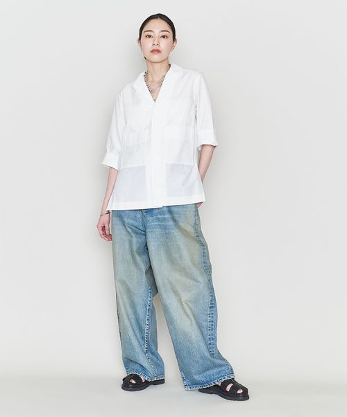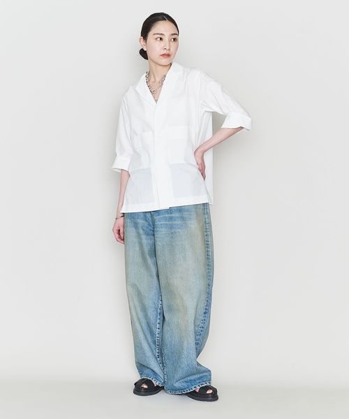 ボリュームデニムにあえてタックインしてすっきりとしたバランスの着こなしを楽しめます。
