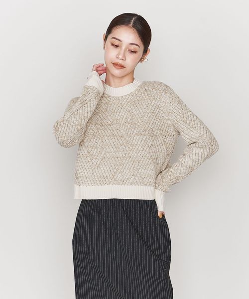 スパンコールを散りばめた表情のあるリブ編みと襟と袖口のコンビ配色が華やかなクルーネックニット。