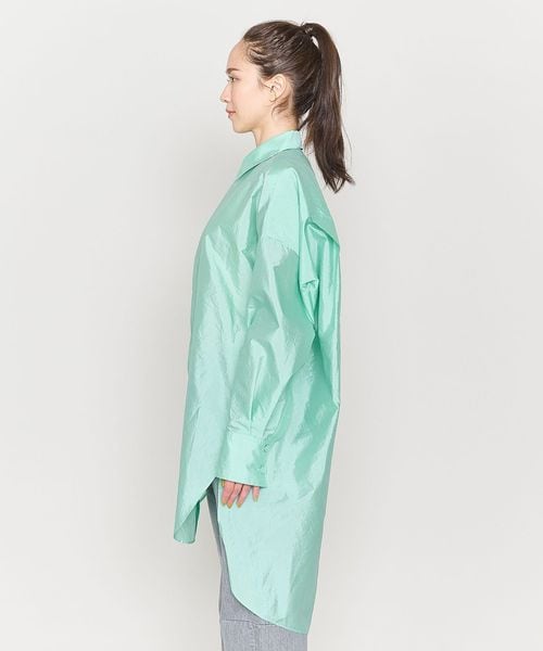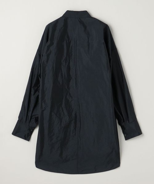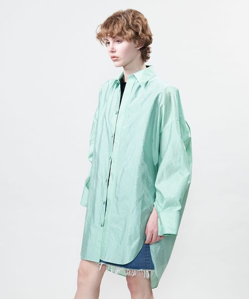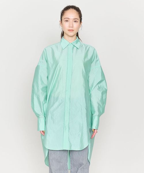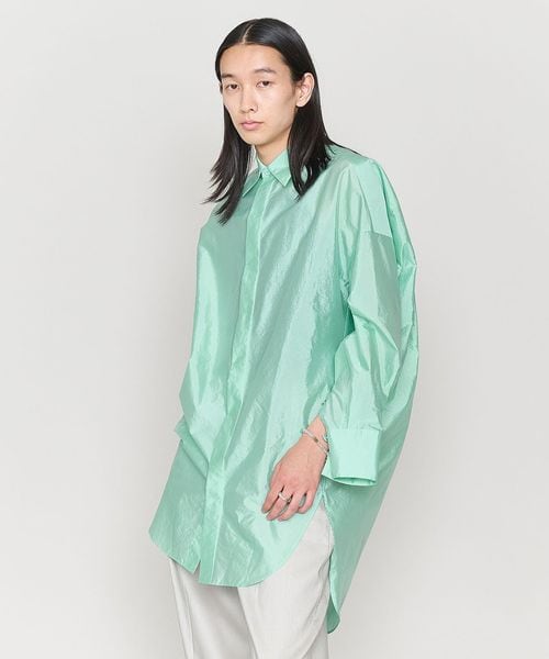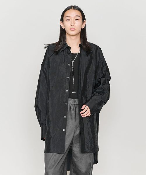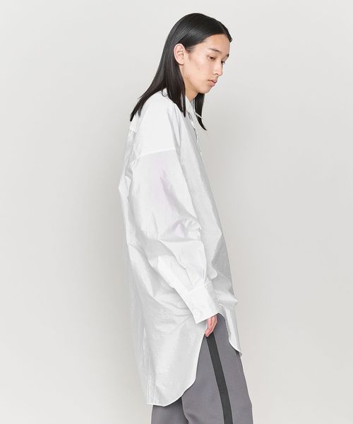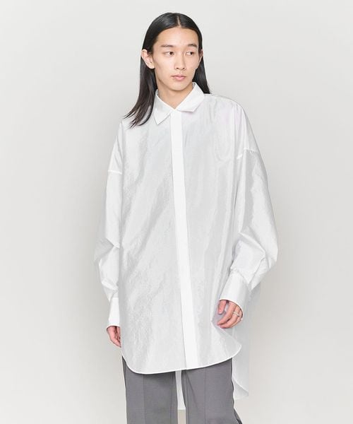 前後の着丈に差をつけた比翼デザインのビッグシルエットのレギュラーカラーシャツ。