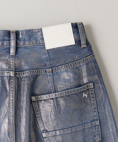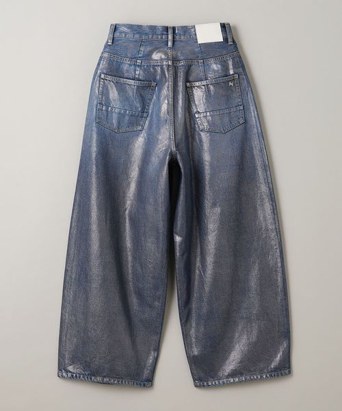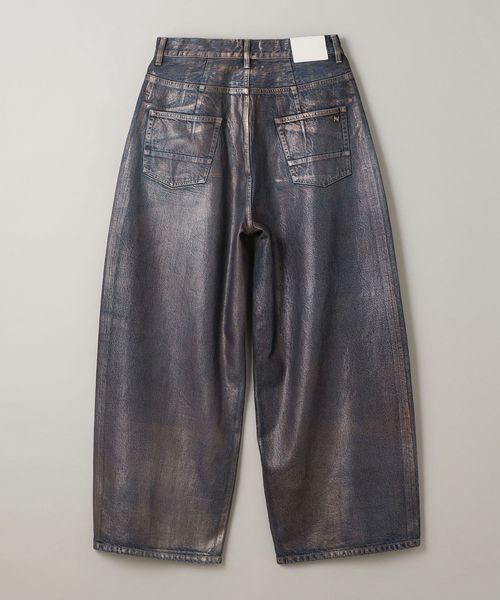 箔コーティングを施した独特の表情が目を引くバルーンシルエットのワイドデニムパンツ。