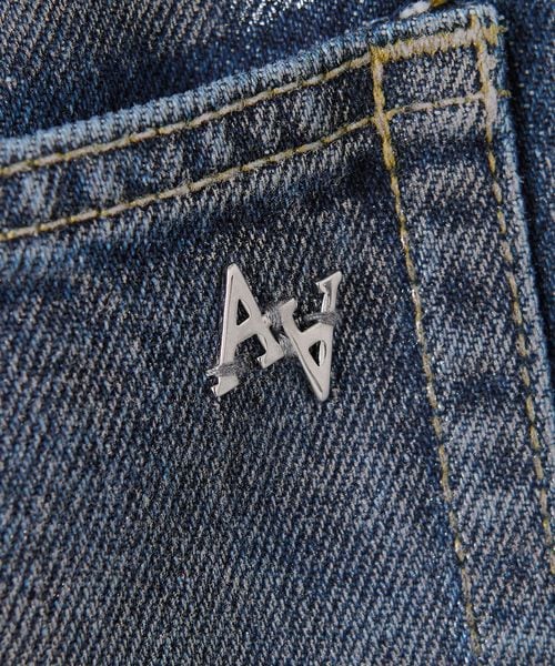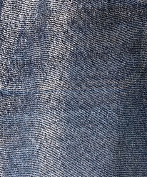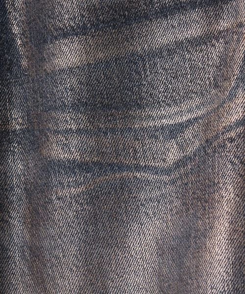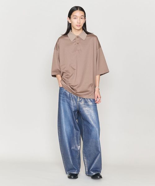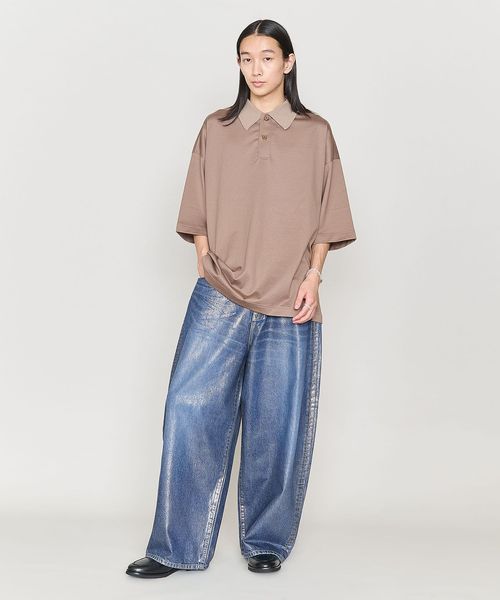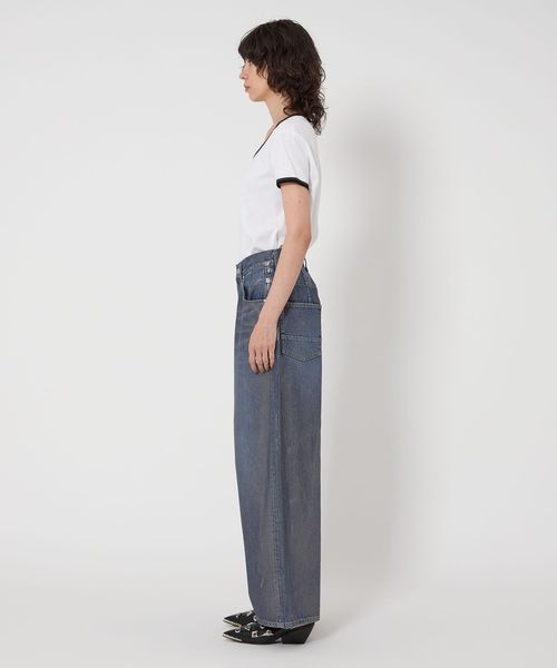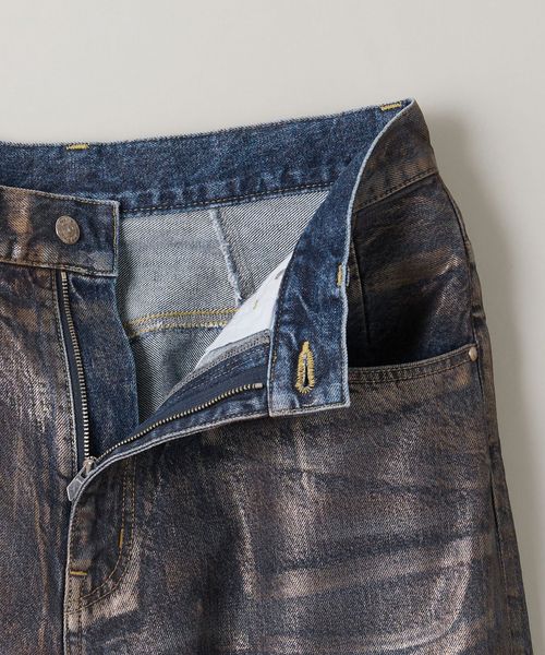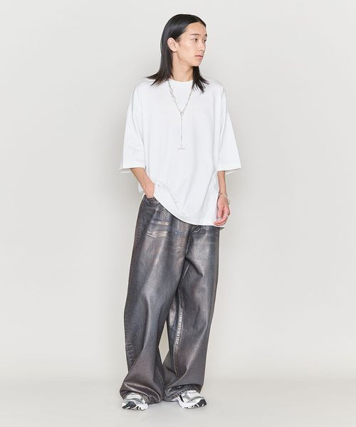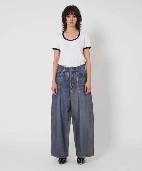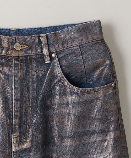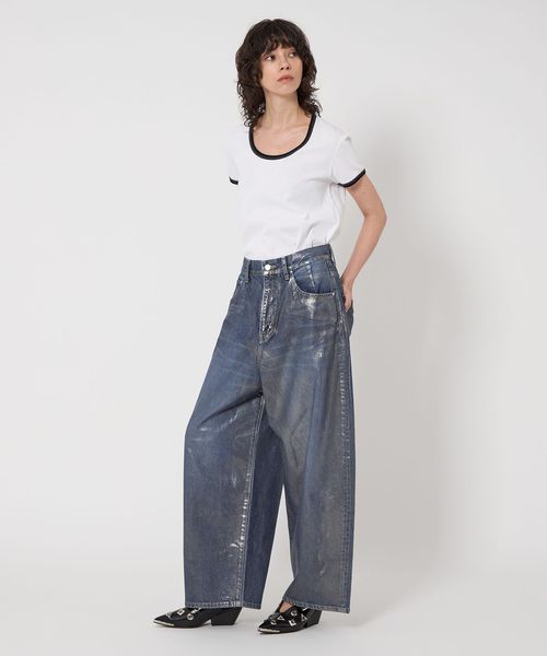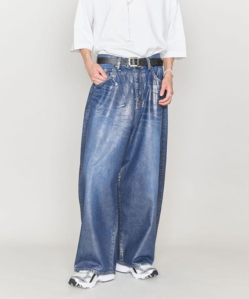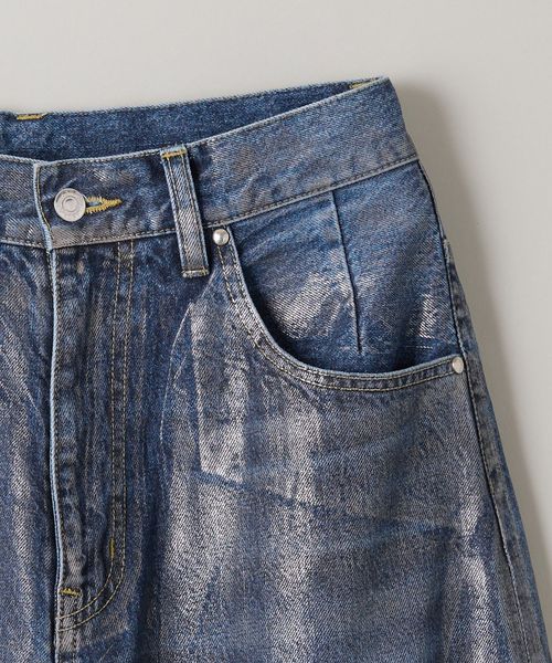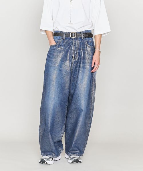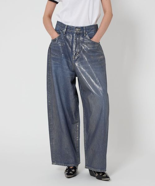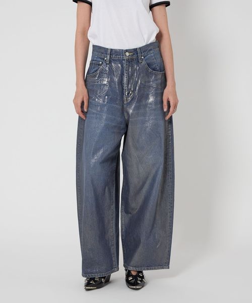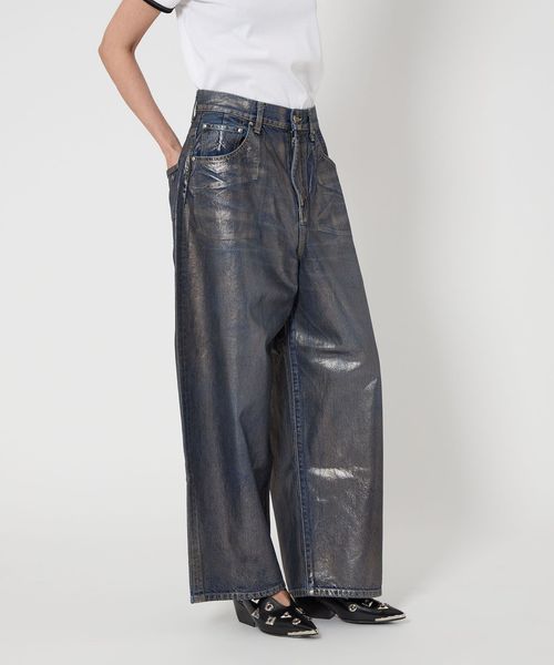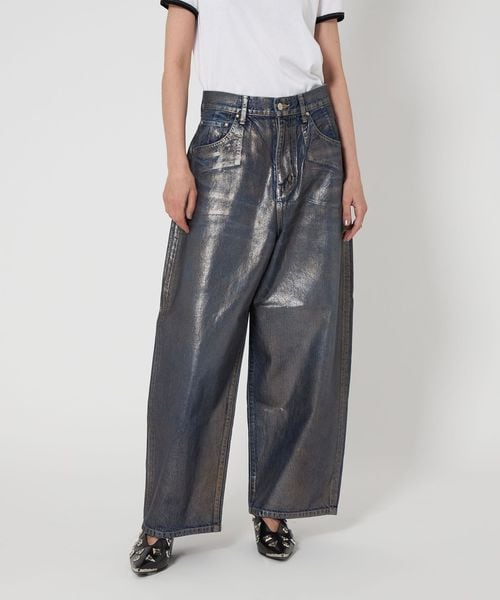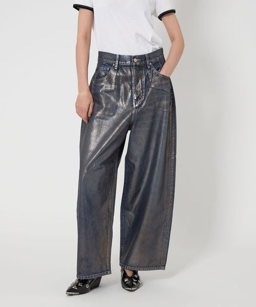 箔コーティングを施した独特の表情が目を引くバルーンシルエットのワイドデニムパンツ。