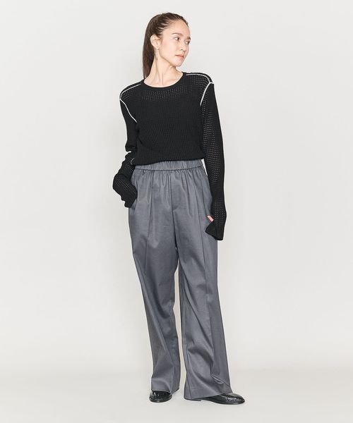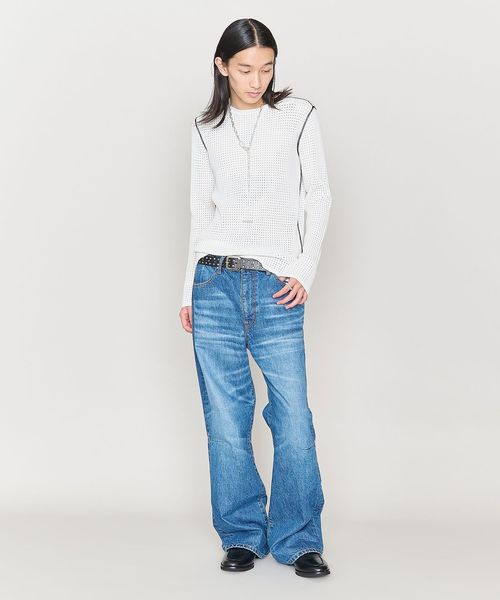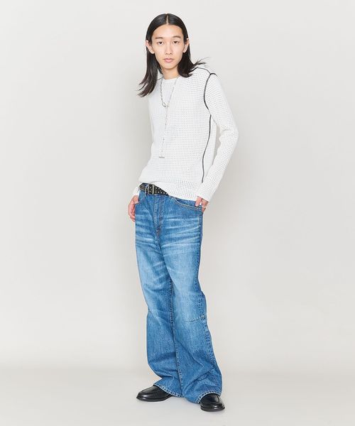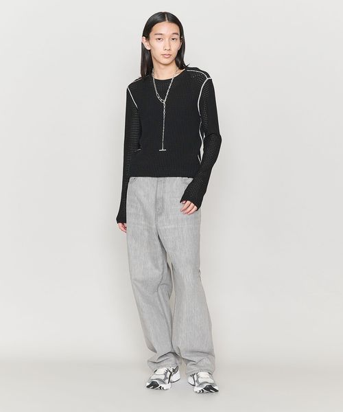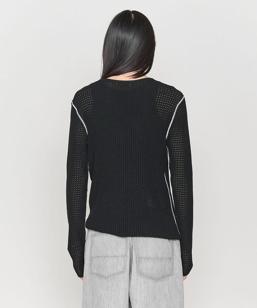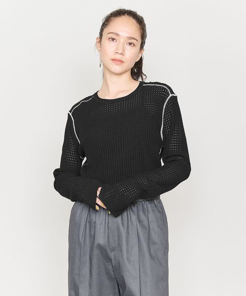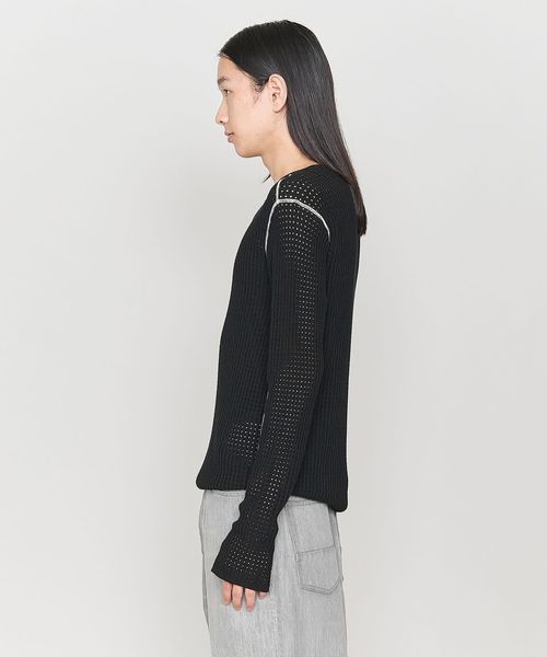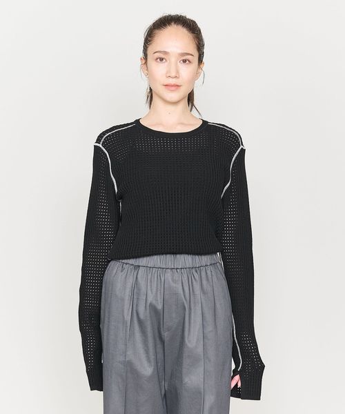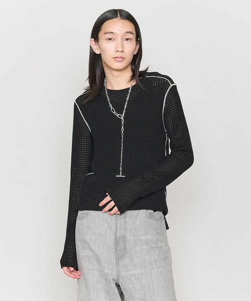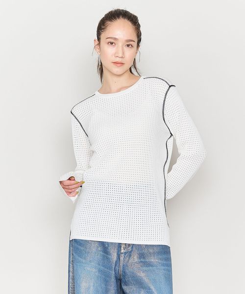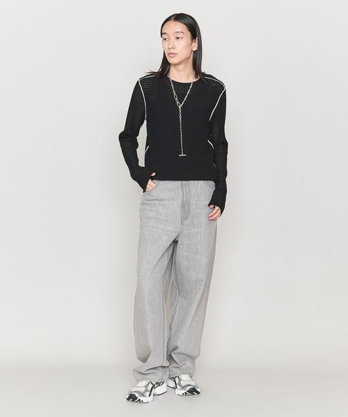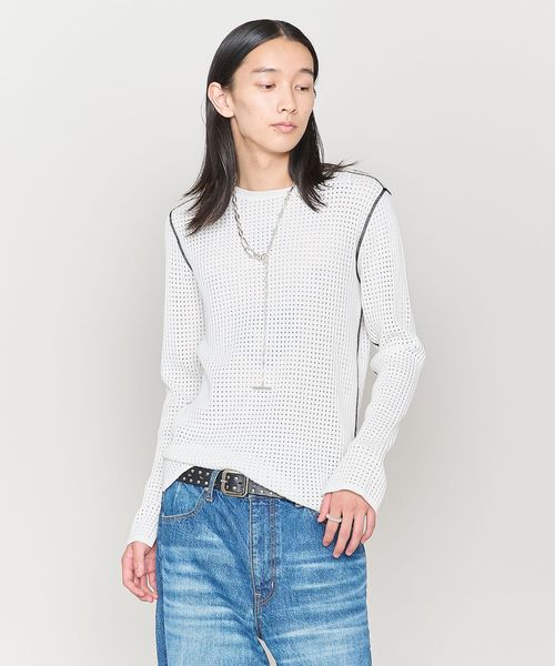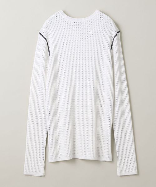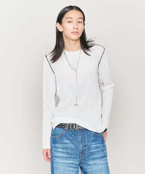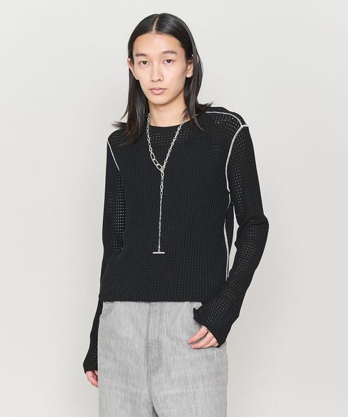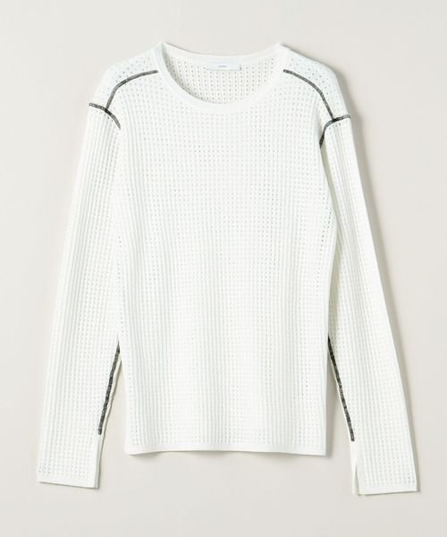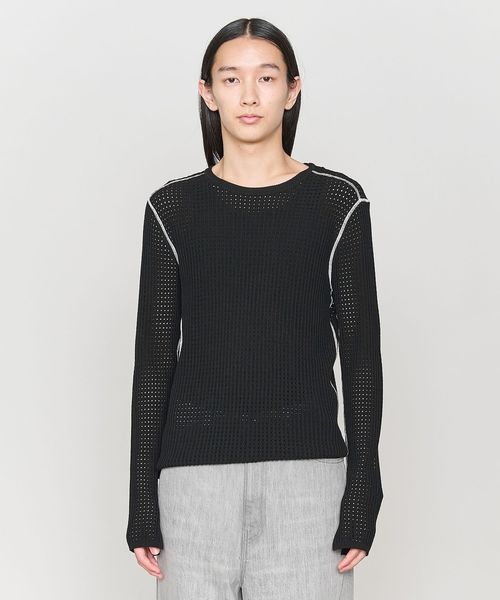 シアー感と配色ステッチが目を引くクルーネックニットをユニセックスで提案。