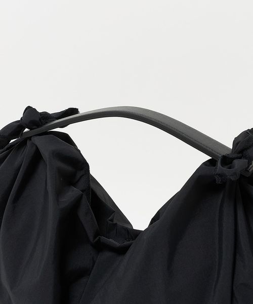 繊細に設計されたミニマルなレザーハンドルに、風呂敷を想起させる一枚布を大胆にドッキングしたSサイズのバッグ。