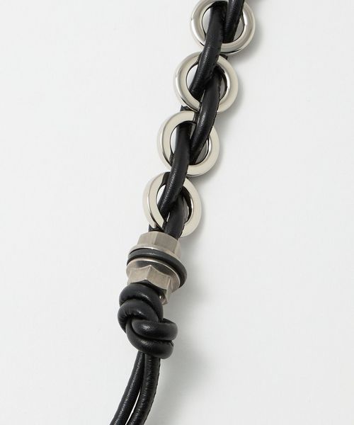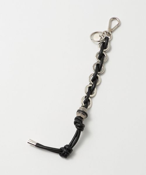 メタルリングに、レザーコードをていねいに組み合わせたチェーンチャーム。