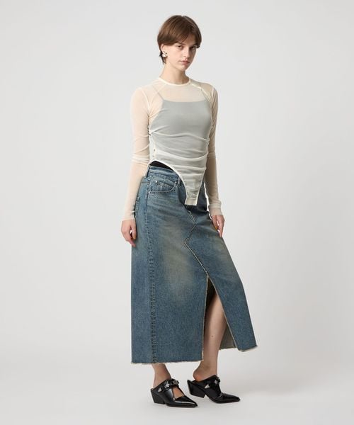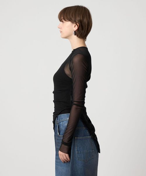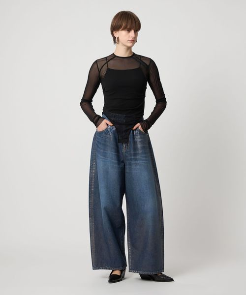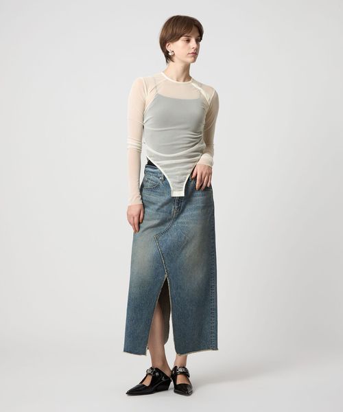 首まわりに斜めに入ったスリットがポイントで、詰まったネックと相まってモードな印象をもたらします。