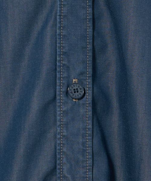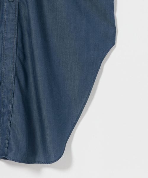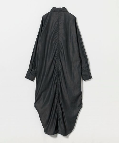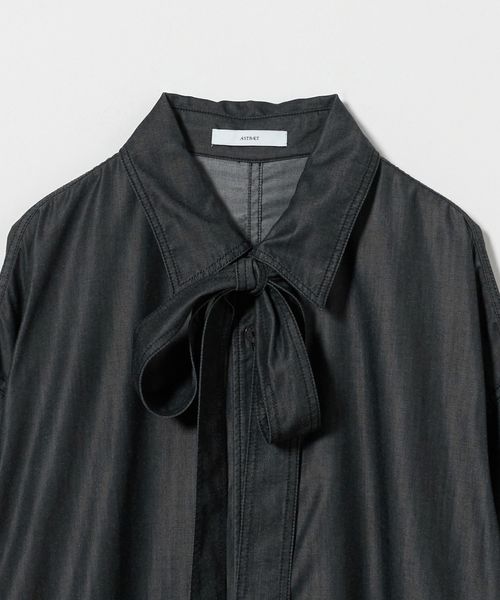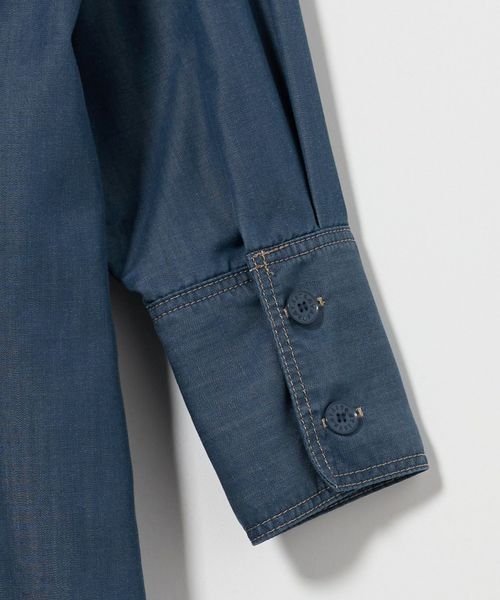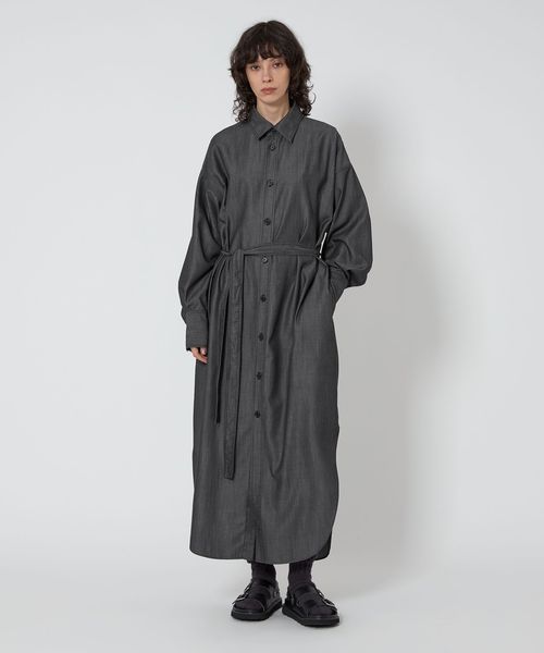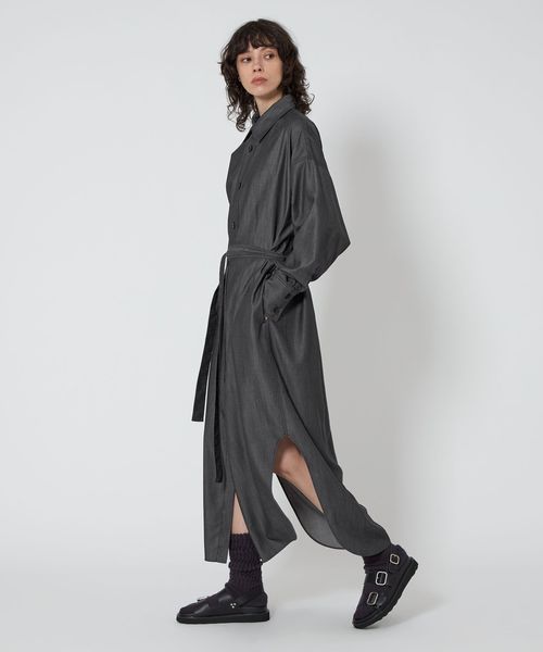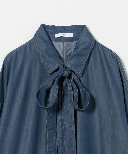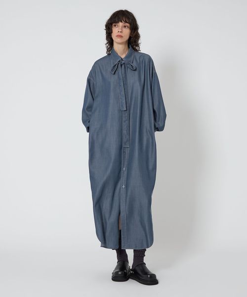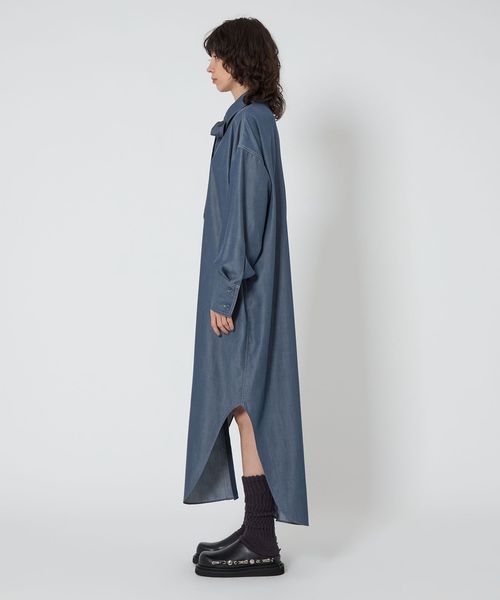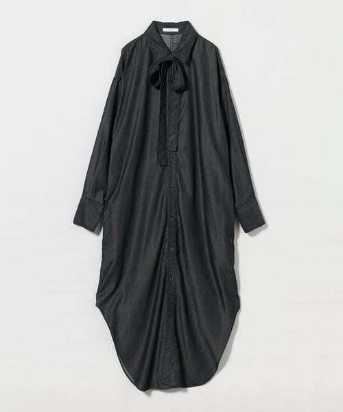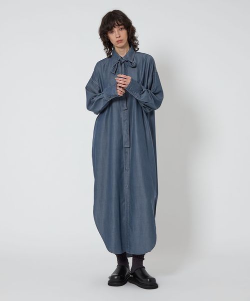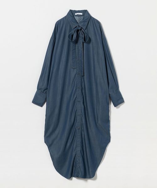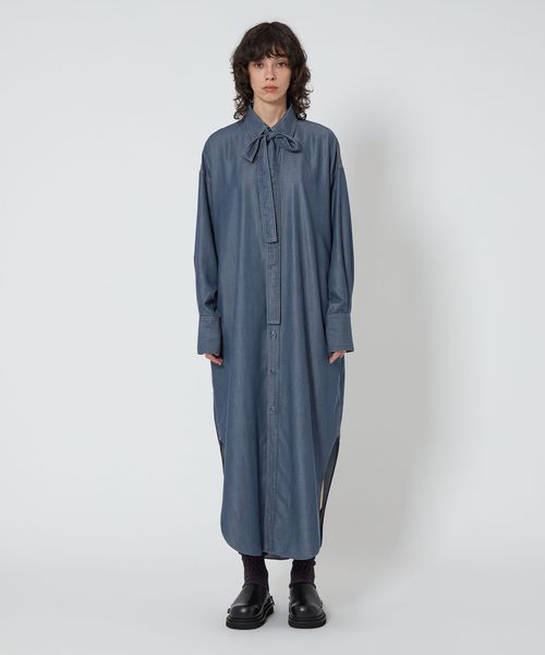 サイドスリットと共地のリボンが特徴のデニムライクなシャツワンピース。