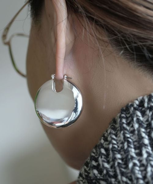 鏡のように艶めく存在感のあるラウンドモチーフピアス。
