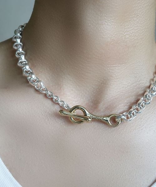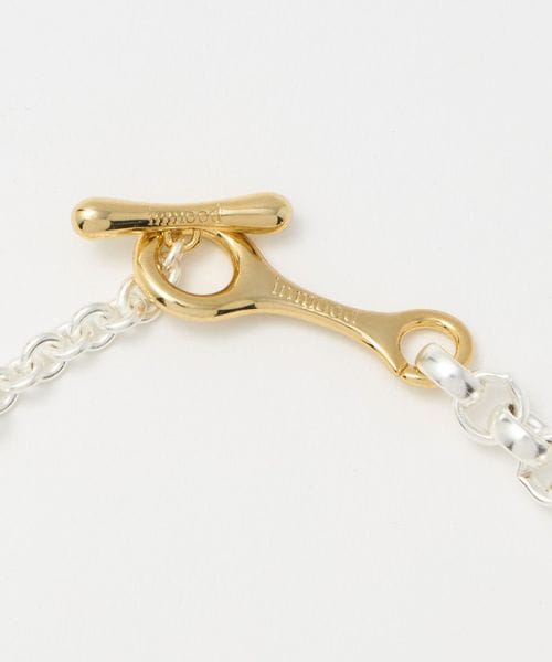 シルバーカラーのチェーンに、ゴールドカラーのWrench(レンチ)をイメージしたパーツを配したアイコニックなチョーカーネックレス。