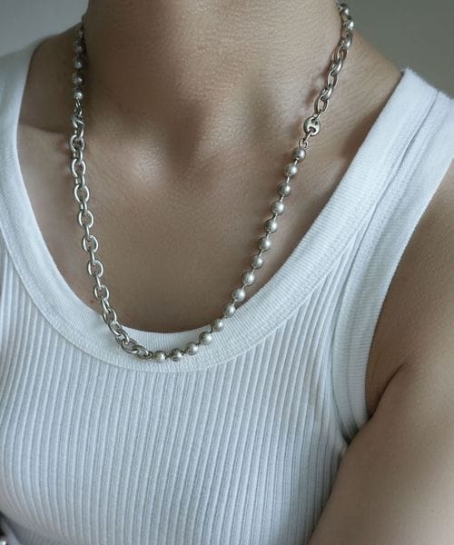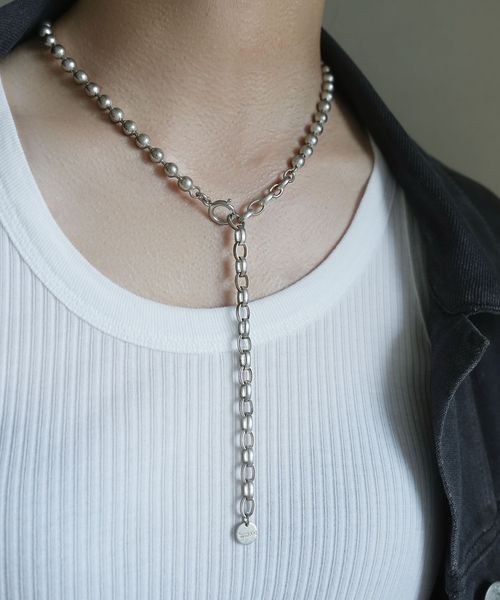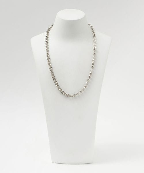 マットなシルバーカラーのボールチェーンと、インダストリアルなチェーンを組み合わせた、構築的バランスが魅力のユニセックスネックレス。