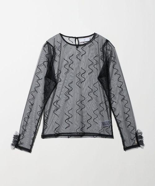 透け感のあるチュール素材にオリジナルのフロッキープリントを施したトップス。
