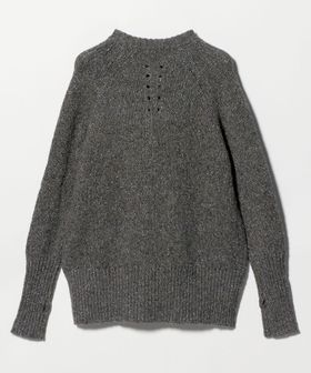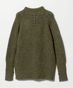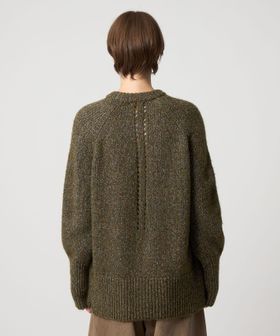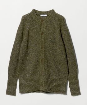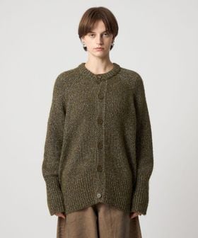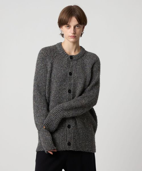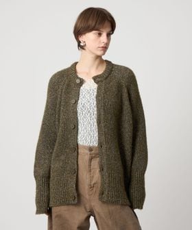 後ろ身頃のセンターにアイレットが2列入っているのがポイントのラグランスリーブ丸首カーディガン。