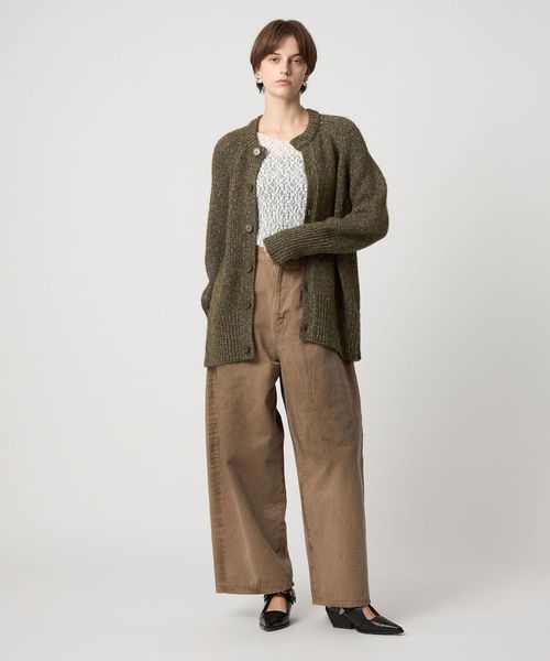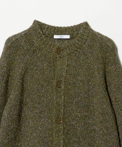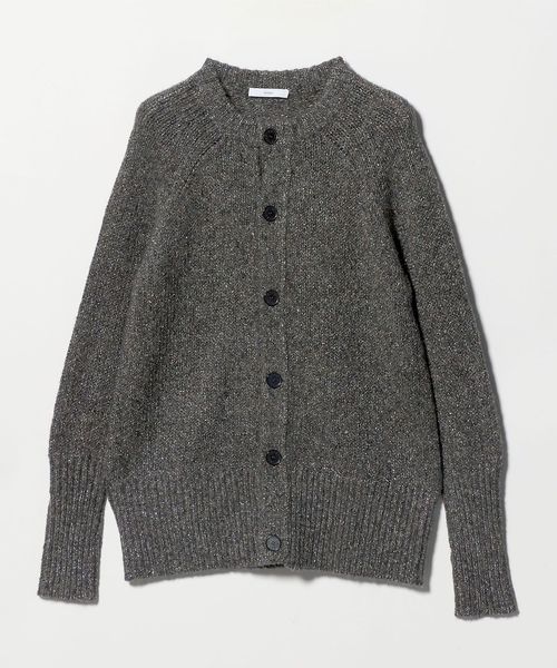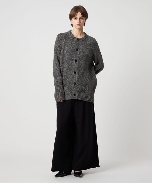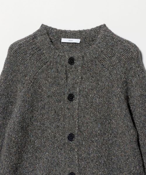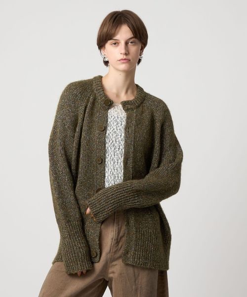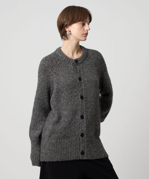 後ろ身頃のセンターにアイレットが2列入っているのがポイントのラグランスリーブ丸首カーディガン。