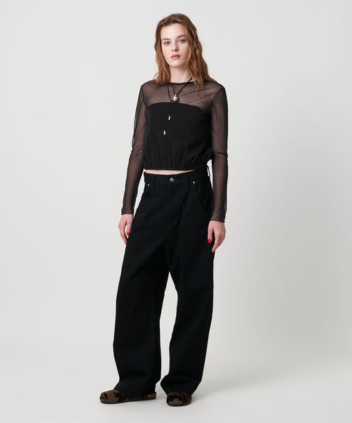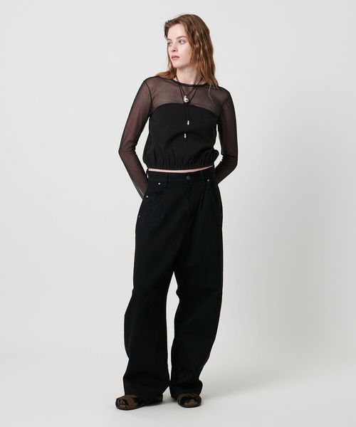 ショート丈なのでジャストウエストやハイウエストボトムとも好相性な1枚です。