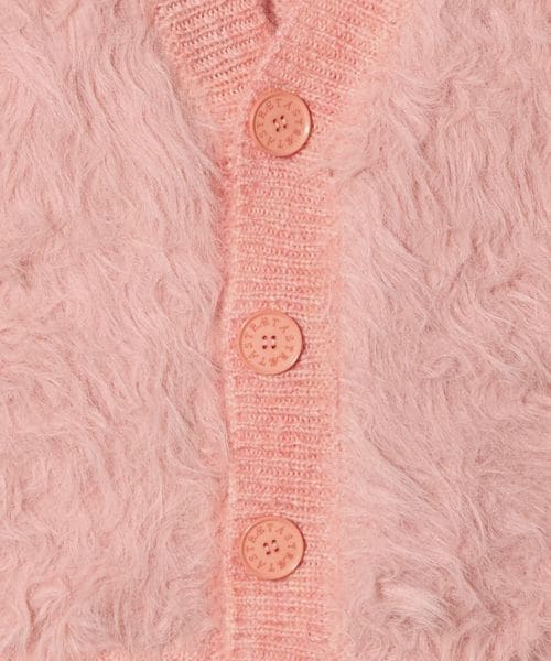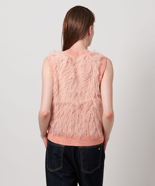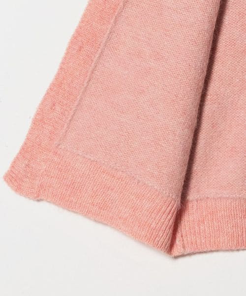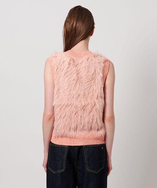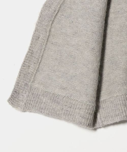 表に毛足の長いフェザーヤーン、裏にストレート糸で編地を安定させて表をさらに起毛させました。