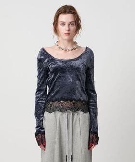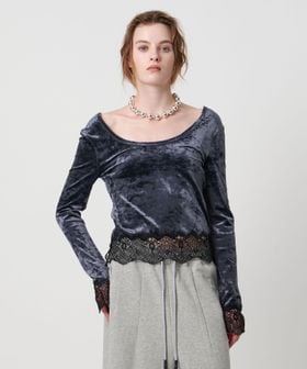 ベロアとレースの異素材コンビデザインが華やかなUネックカットソー。