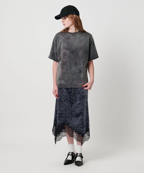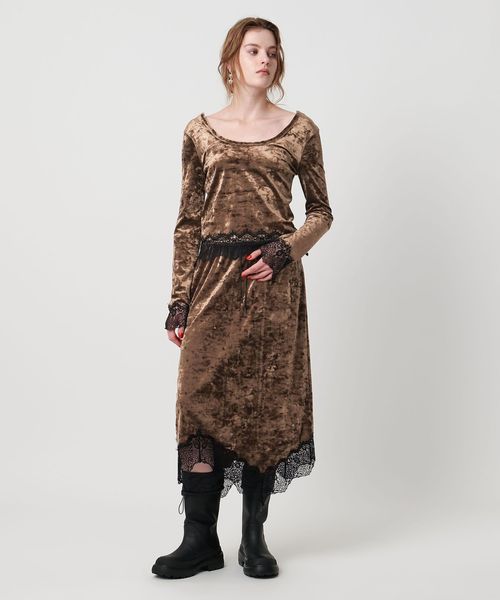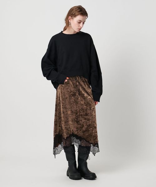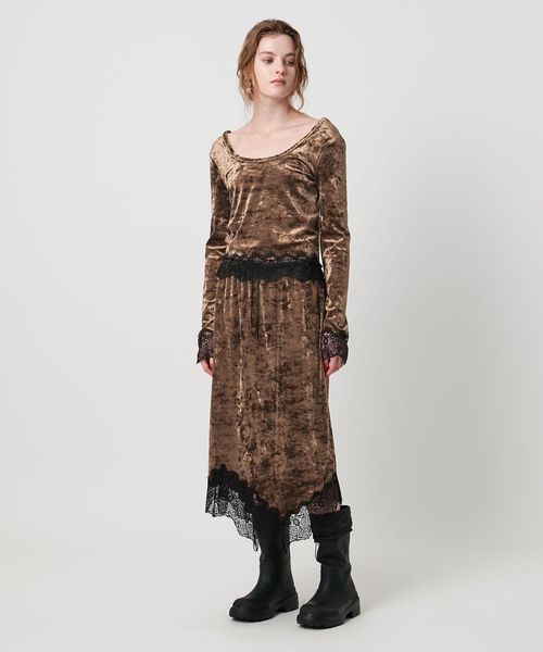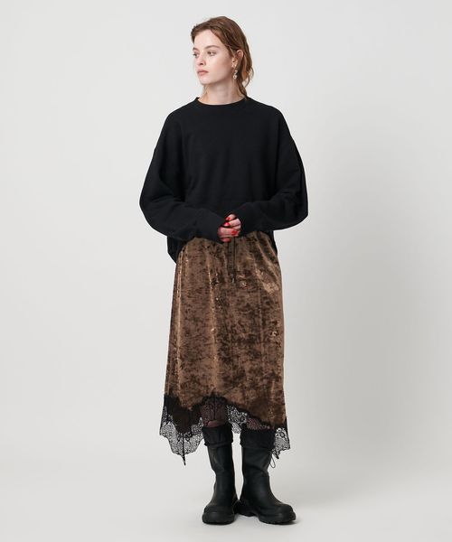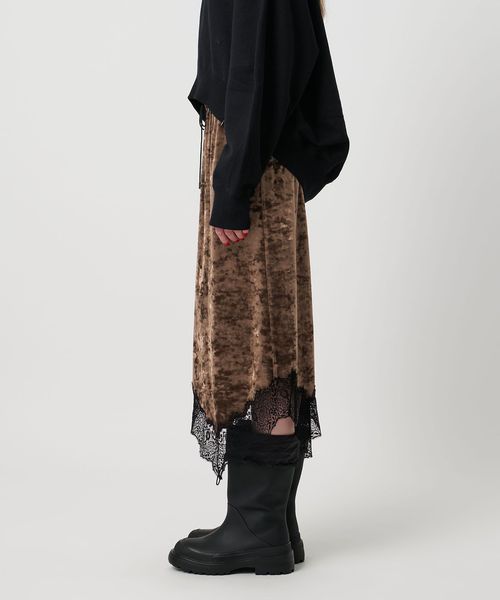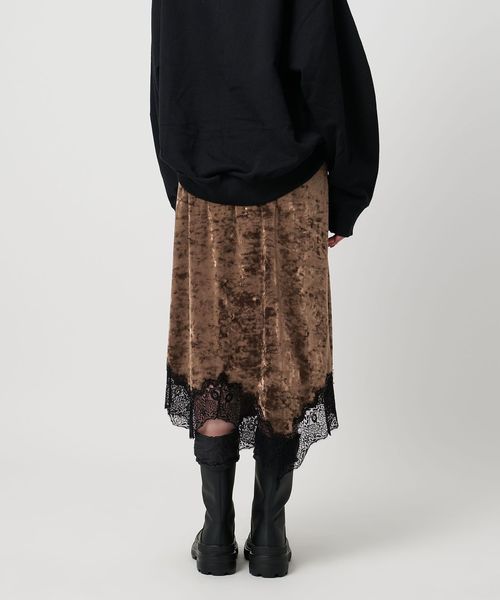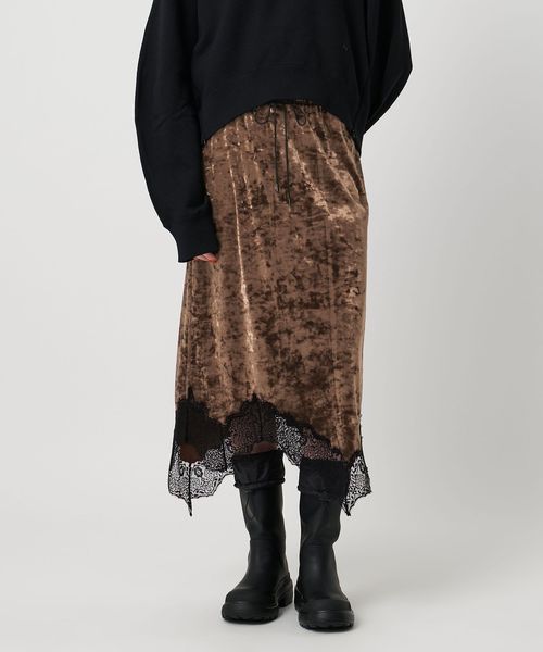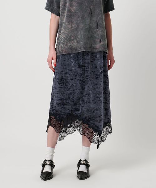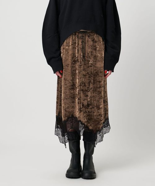 裾にレースをあしらったイレギュラーヘムのベロアイージースカート。