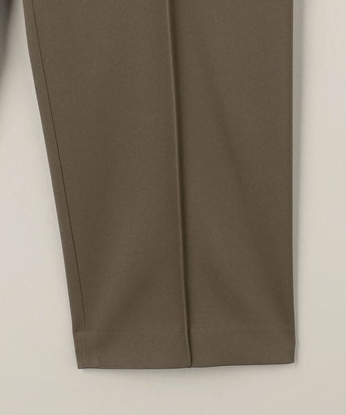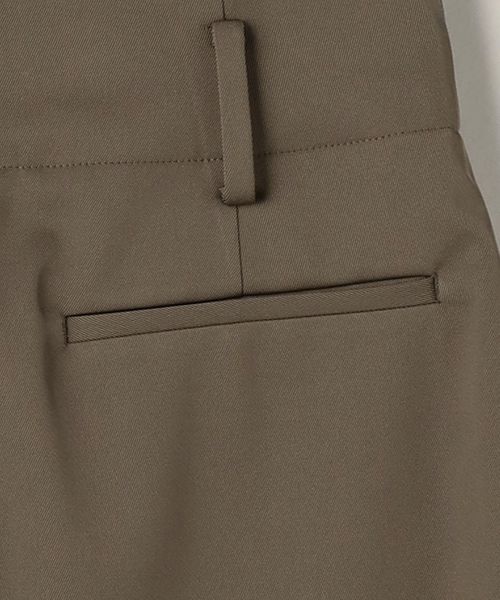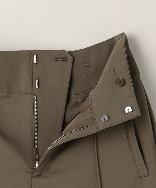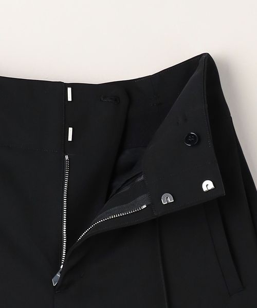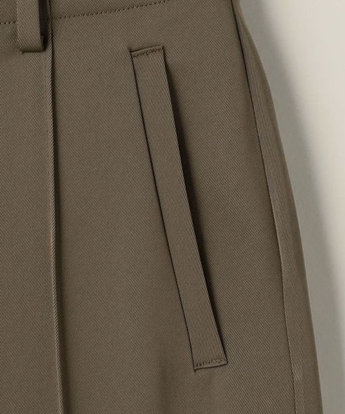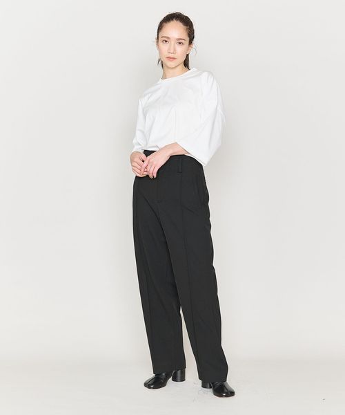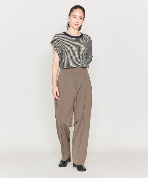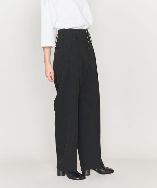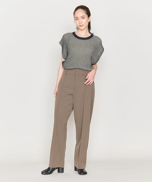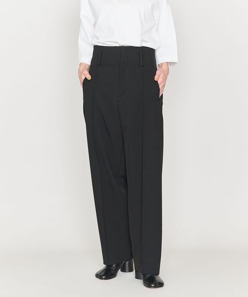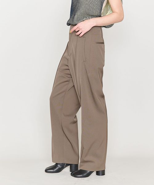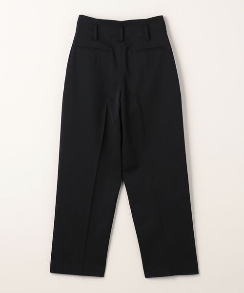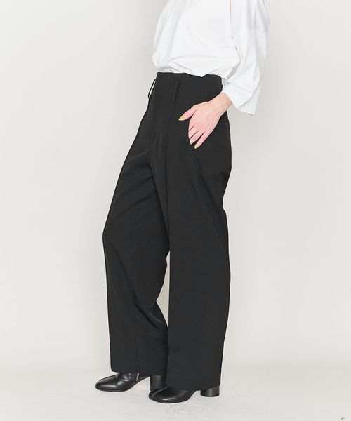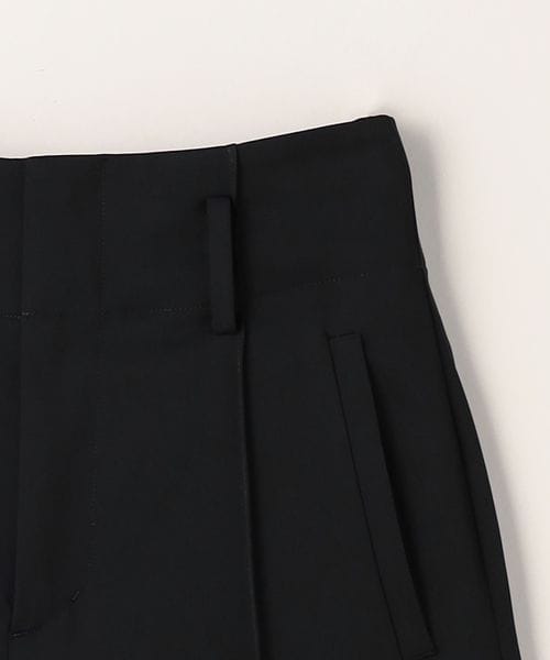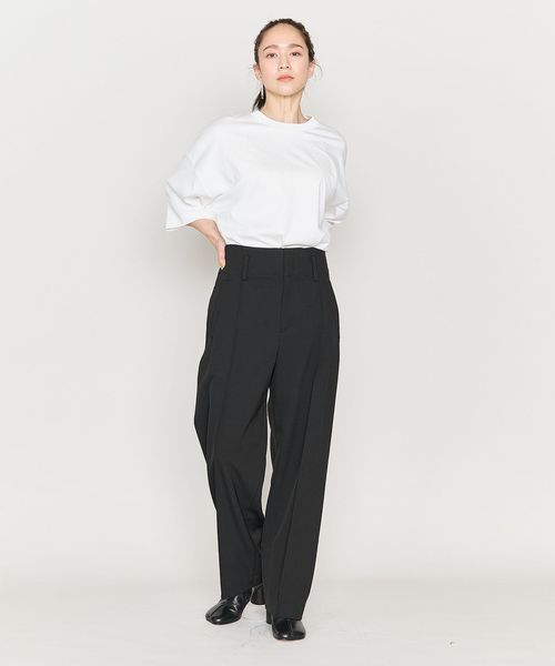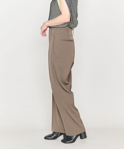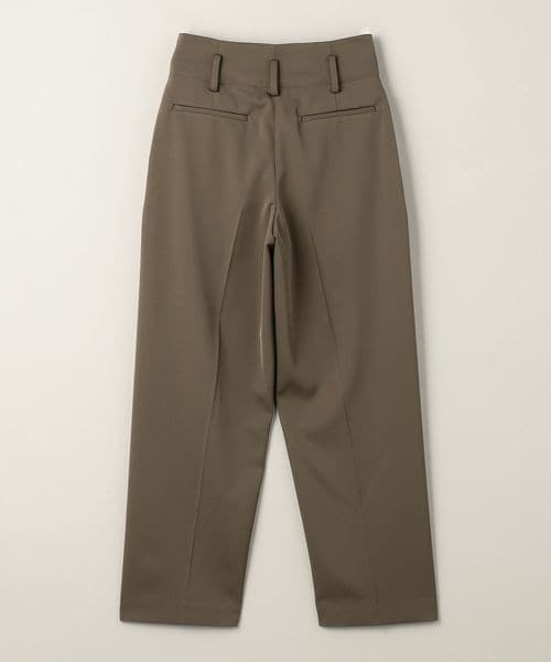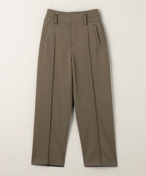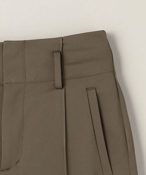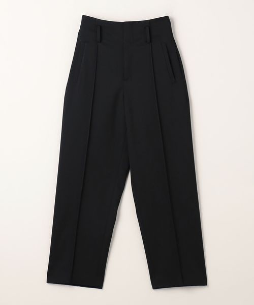 フロントのピンタックと広めのウエストベルトがポイントのパンツ。