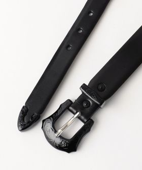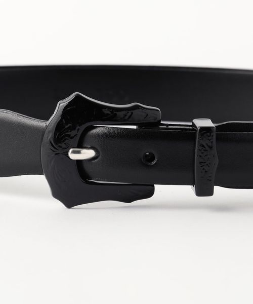 ブラックカラーのメタルバックルがモードな雰囲気漂うベルト。