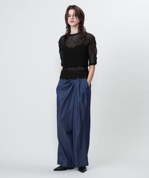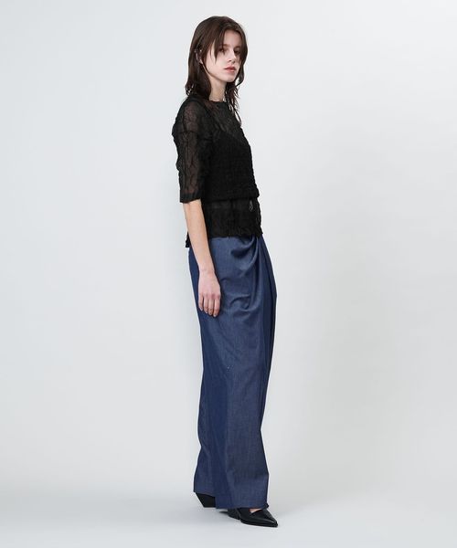 ワイドシルエットボトムやデニムなどにあわせてタックインはもちろん、裾を出してもウエスト周りがもたつかずにすっきりとバランス良く着こなせます。