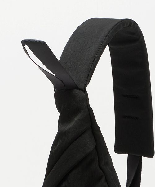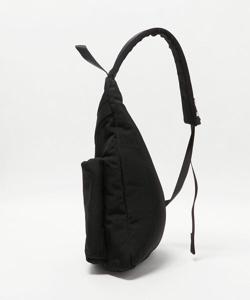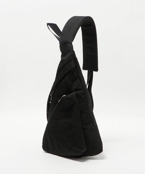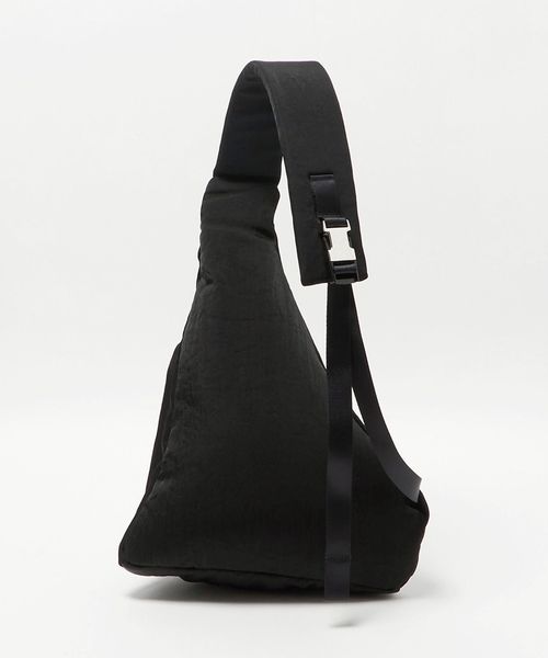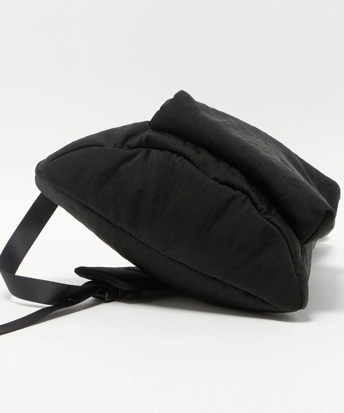 一本のストラップで背中に吊るすように持つデザインの中綿入りナイロン素材ショルダーバッグ。