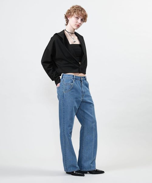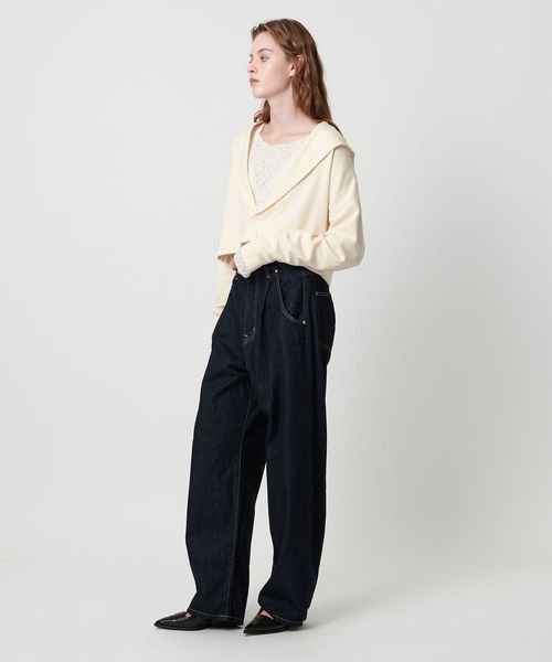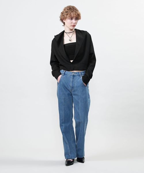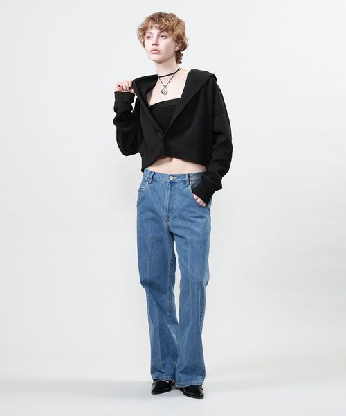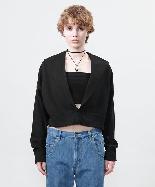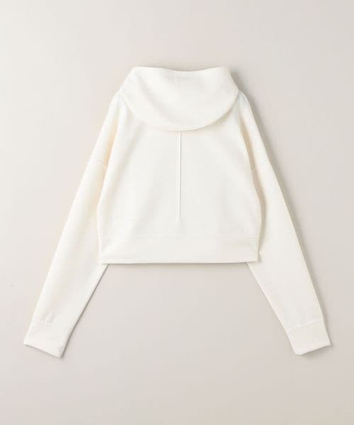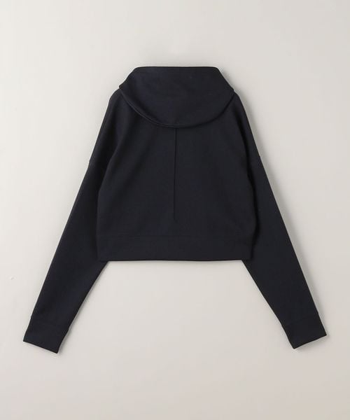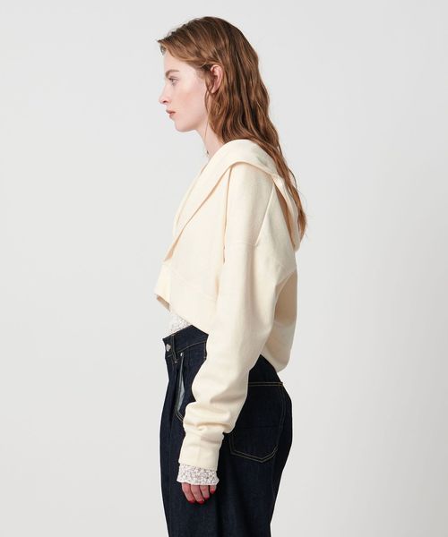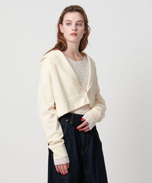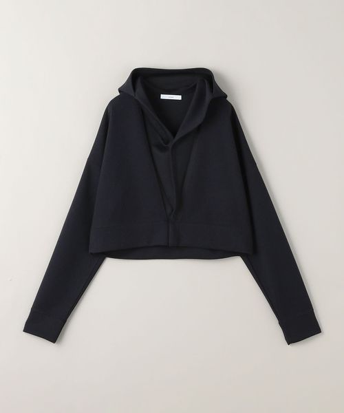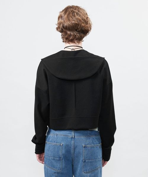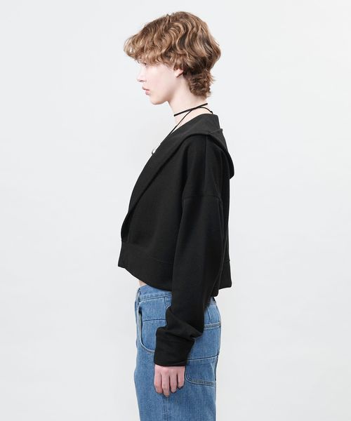 パーカーの前下がりを大きくあけ、ショート丈に仕上げたデザインです。