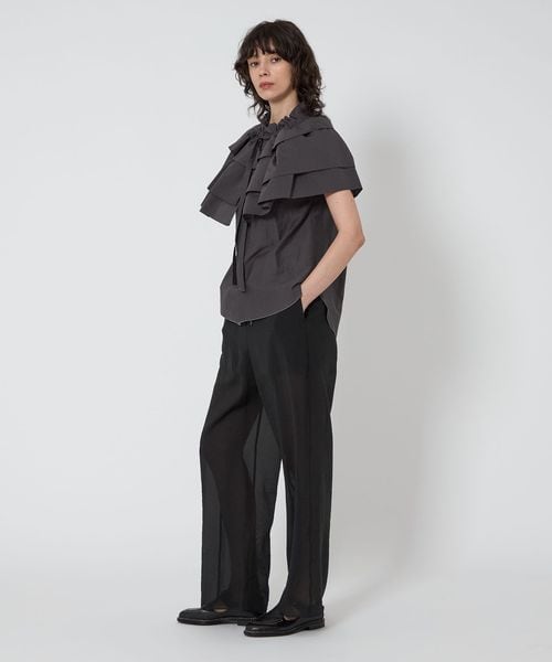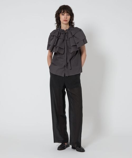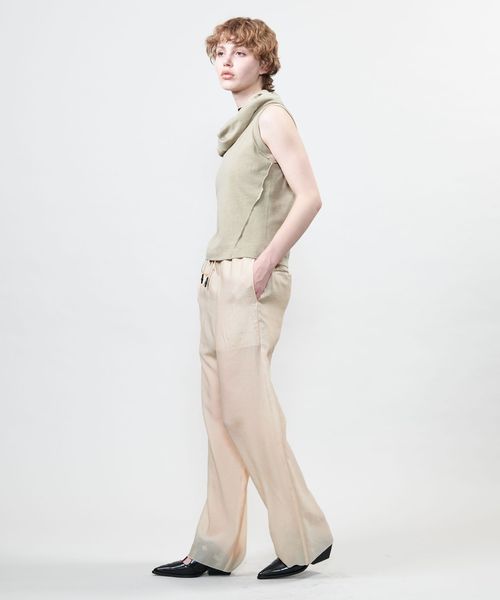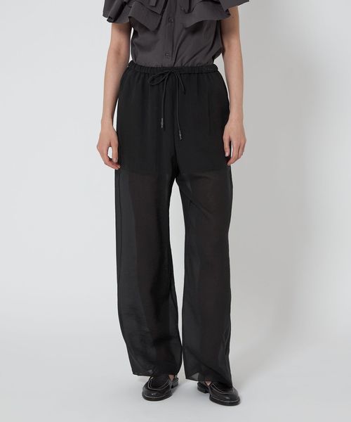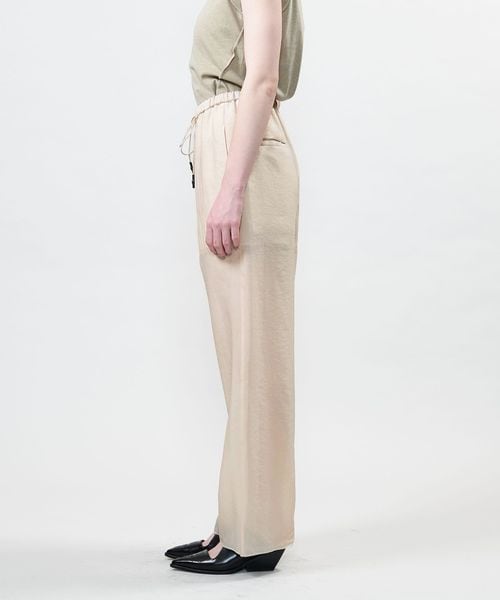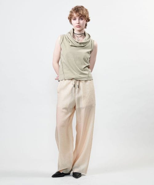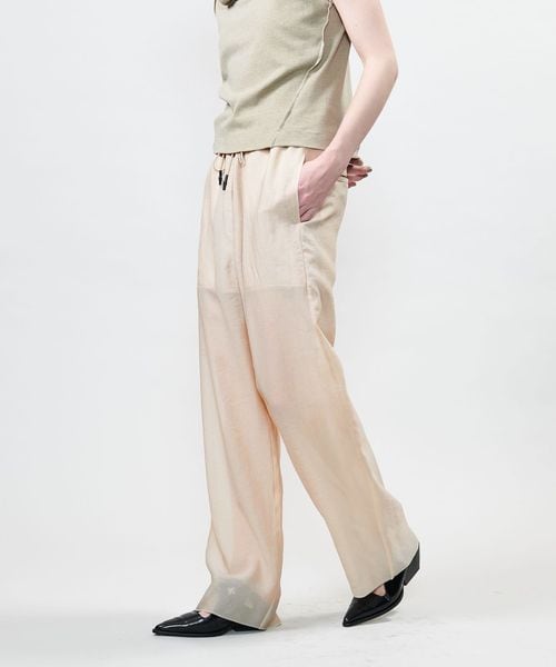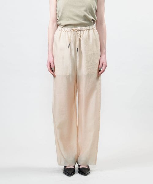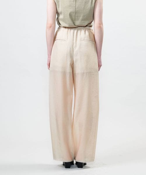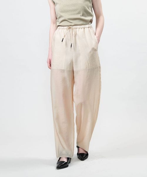 シアー素材を用いたリラックス感のあるウエストドローコード仕様のワイドパンツ。