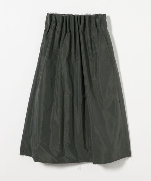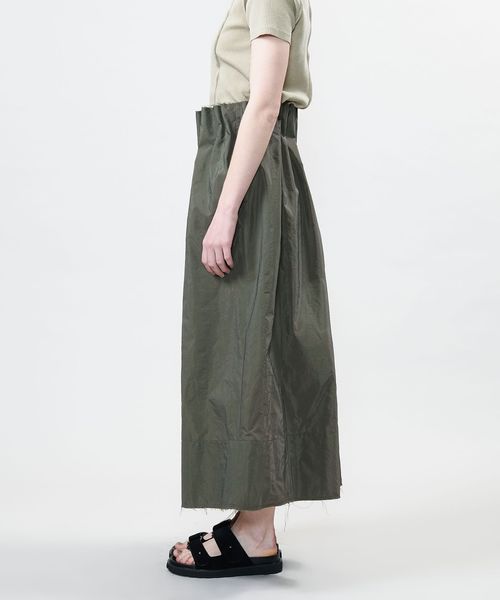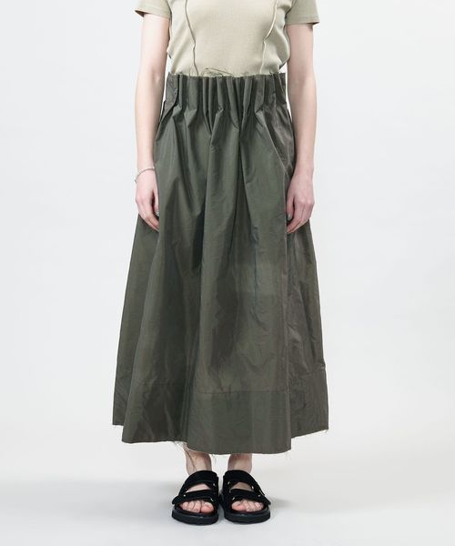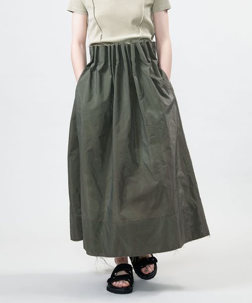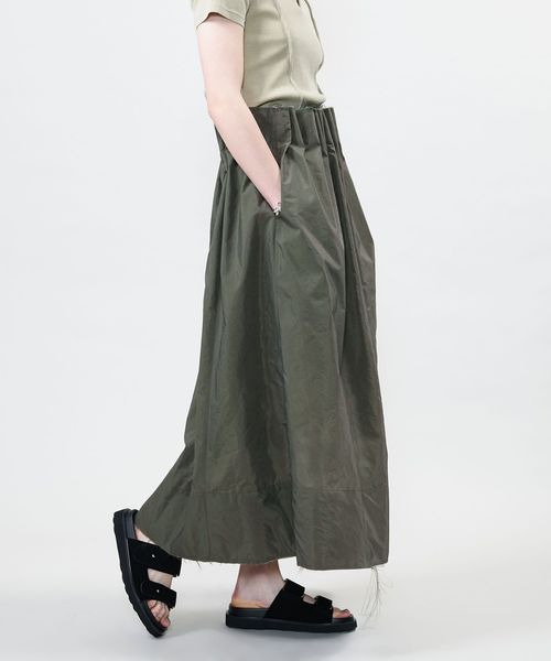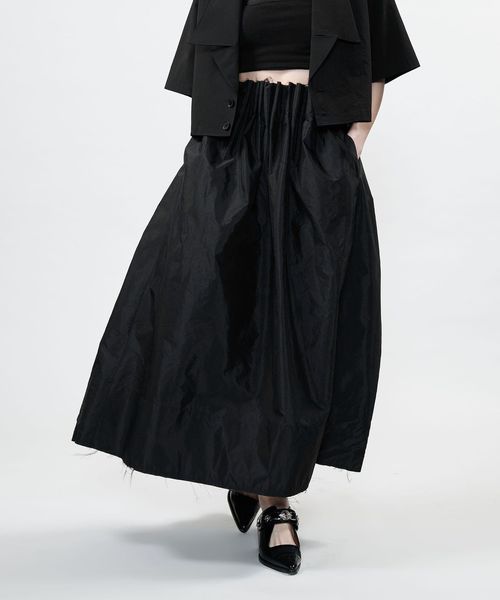 ウエストにイレギュラーな大きめのタックをとったデザインのロングスカート。
