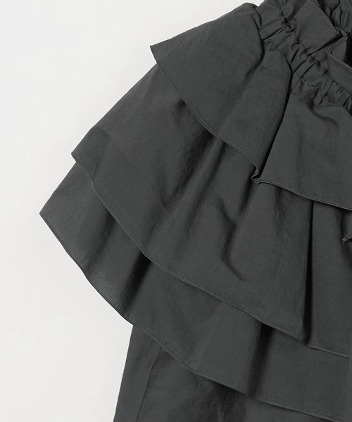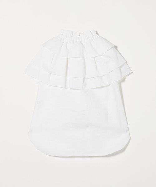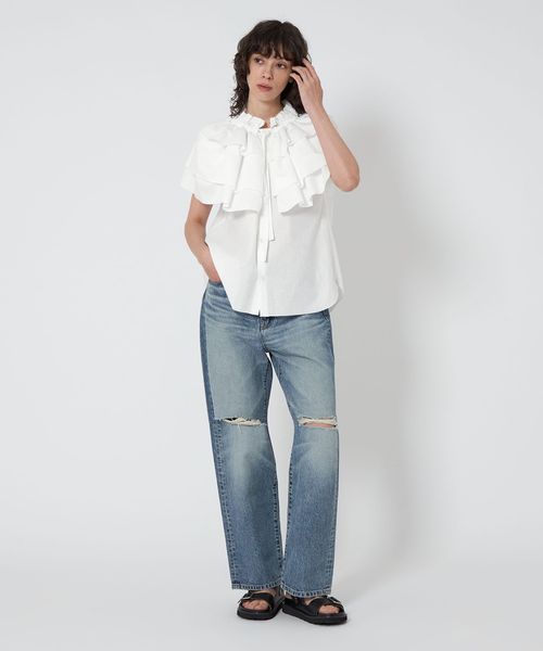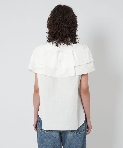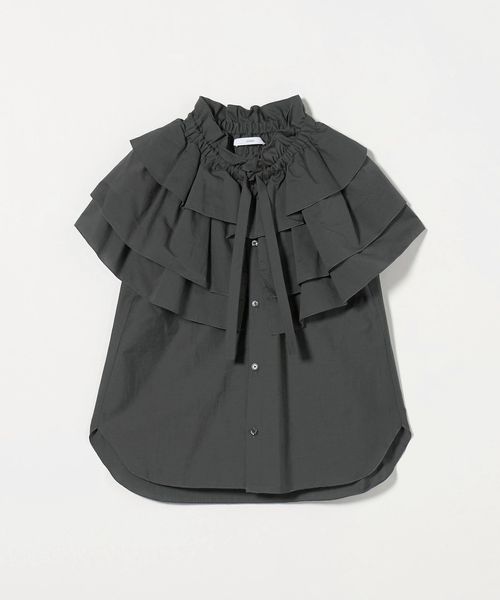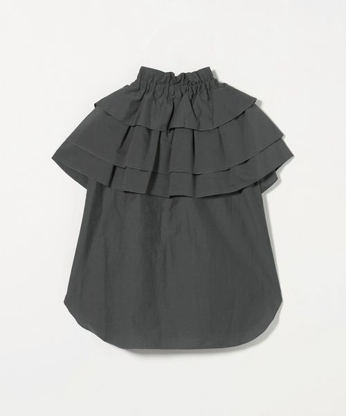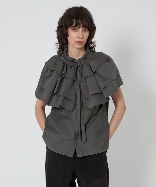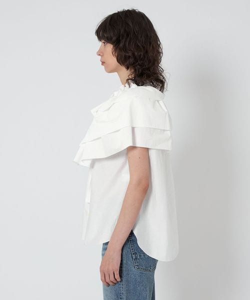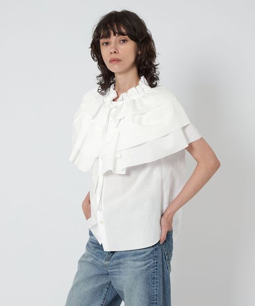ケープのように肩にかかる大きなギャザーティアードフリル襟が華やかなノースリーブブラウス。