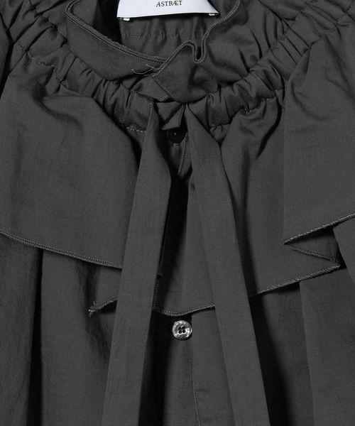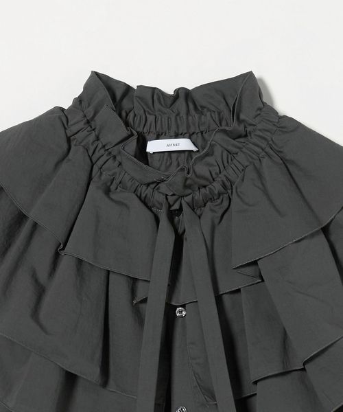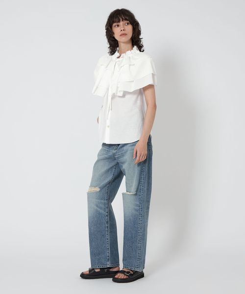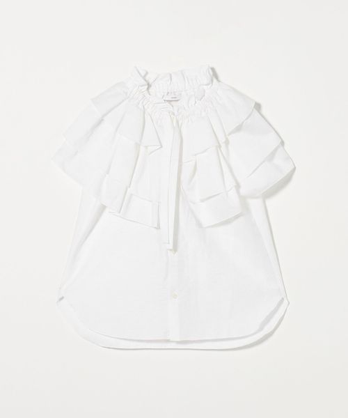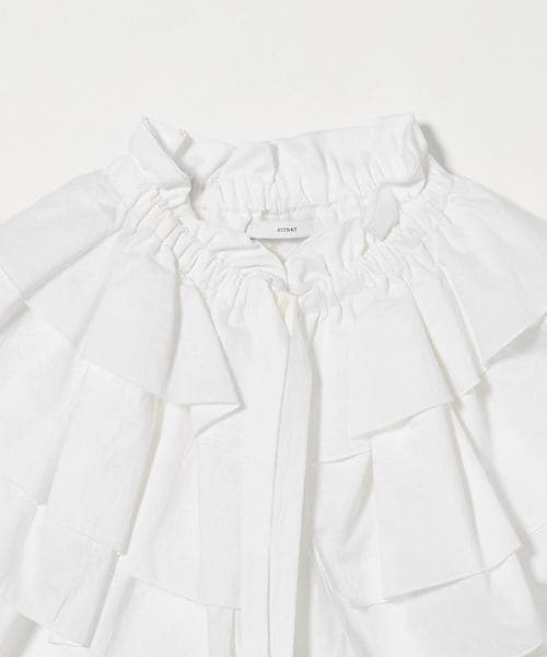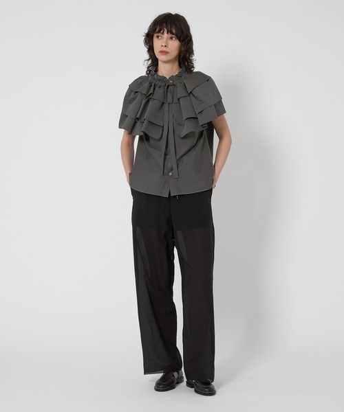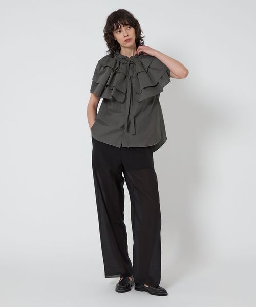 コーディネートの主役になる大ぶりのギャザーのフリルカラーが特徴のブラウス。