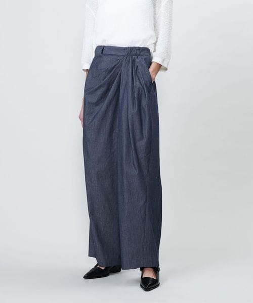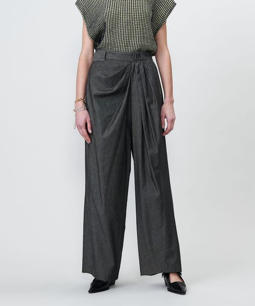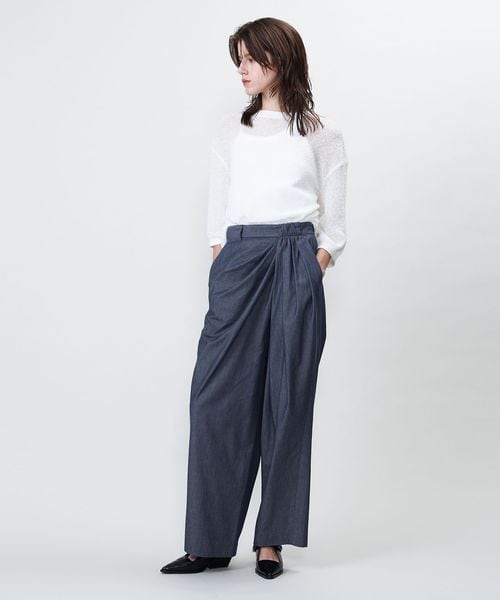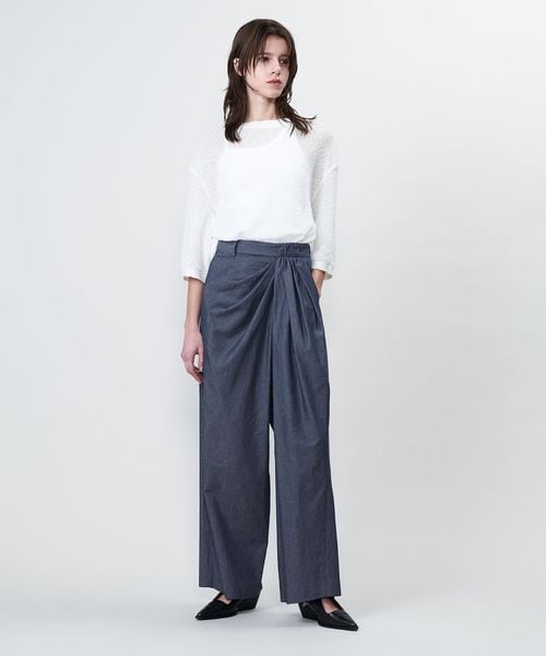 ゆったりとしたワイドシルエットにややアシンメトリーにドレープを施した上品さを感じるデザイン。