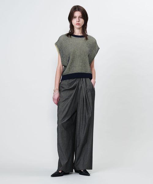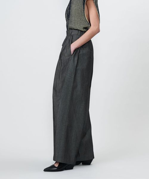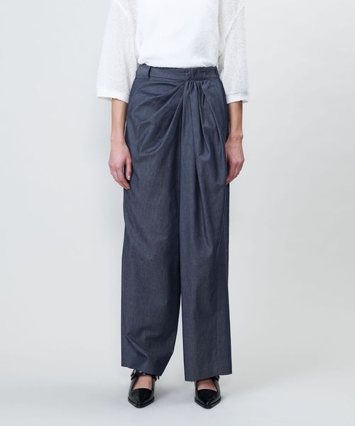 ベルト部分で引き上げてドレープを作ったデザインが特徴のワイドテーパードパンツ。