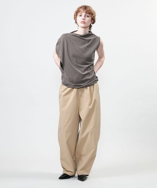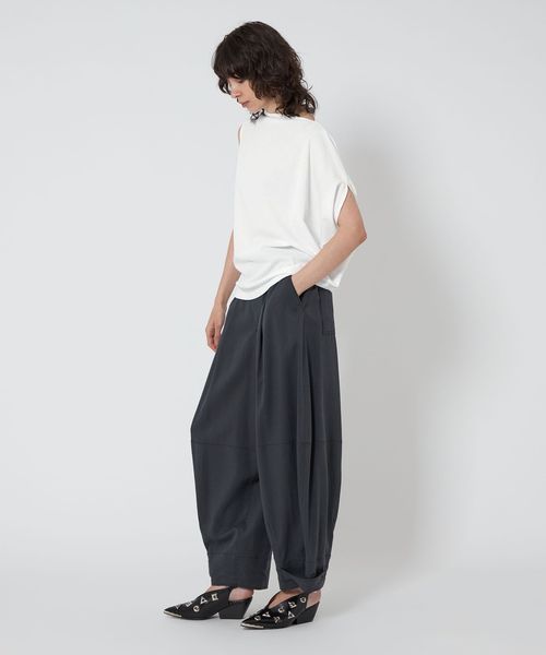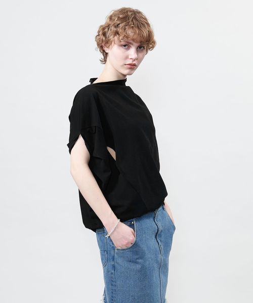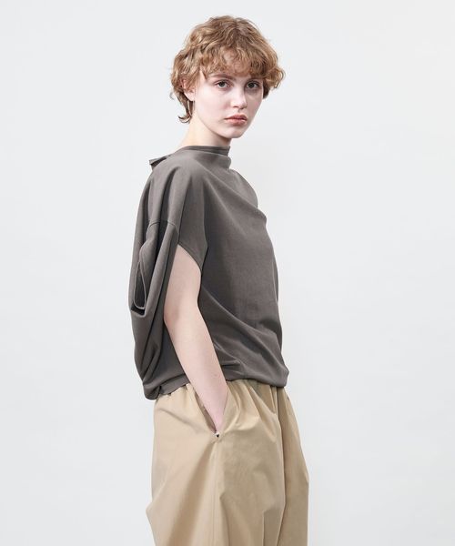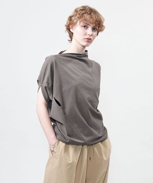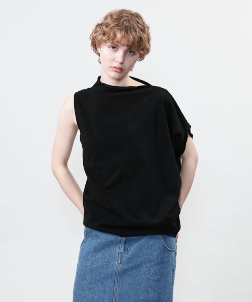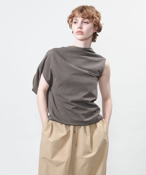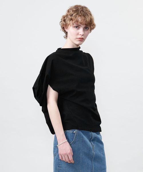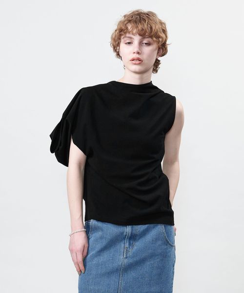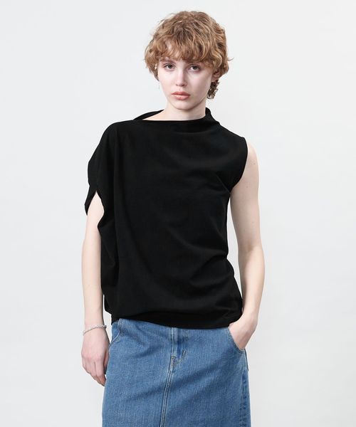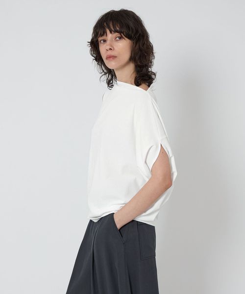 袖を出す位置で着方のアレンジを楽しめるアシンメトリーデザインのカットソー。