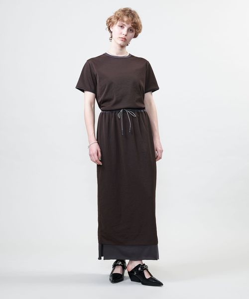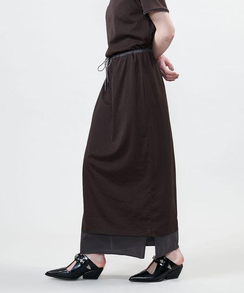 異素材コンビのレイヤードデザインが特徴のイージータイトスカート。
