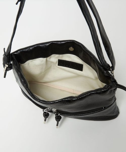 何層も重ねた加工を施し、独特のつや感とシボとシワが特徴的なモードな存在感のある牛革を本体に使用しています。