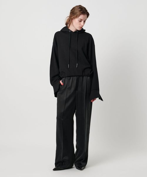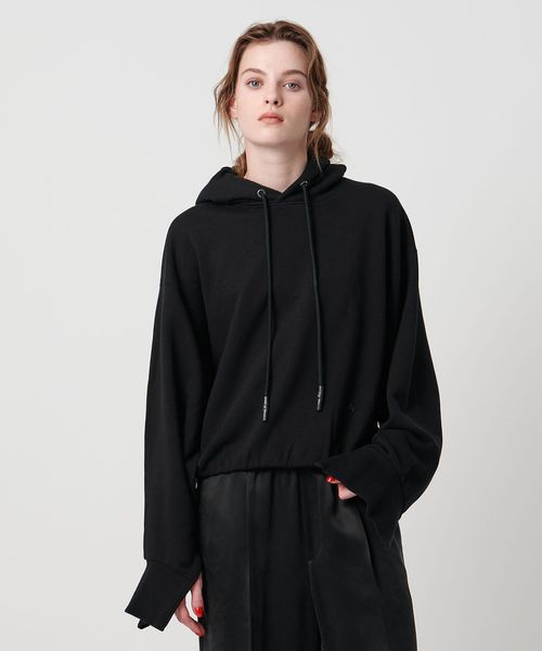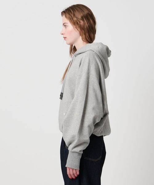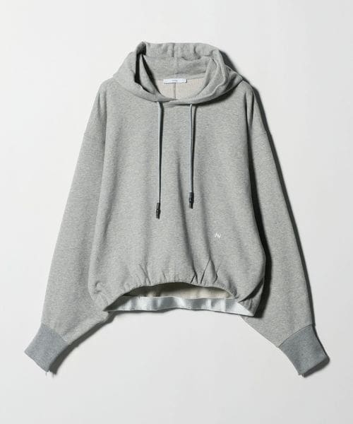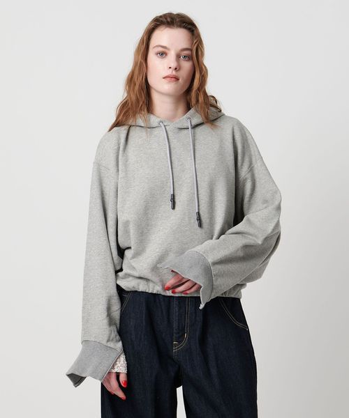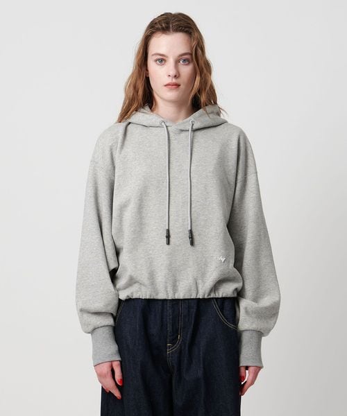 裾をゴム仕様にしてブラウジングできるデザインのプルオーバーパーカー。