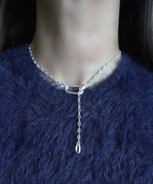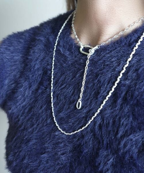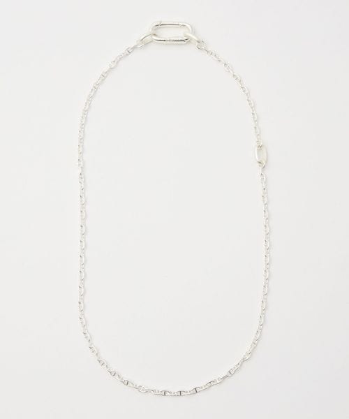 1本はオリジナルのカラビナパーツを使用したショート〜ミドルチェーン、もう1本はやや細身で有機的なラインが特徴のロングチェーン。