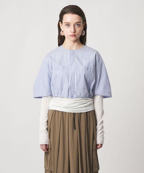 <ASTRAET>ストライプ 2ポケット クロップド ノーカラーブラウス