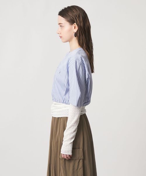 裾にギャザーをあしらったクロップド丈の5分袖ストライプブラウス。