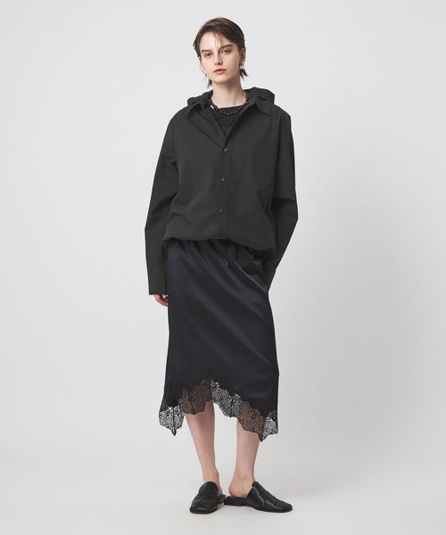 フードを身頃の内側に収納できるデザインのビッグシルエットシャツ。